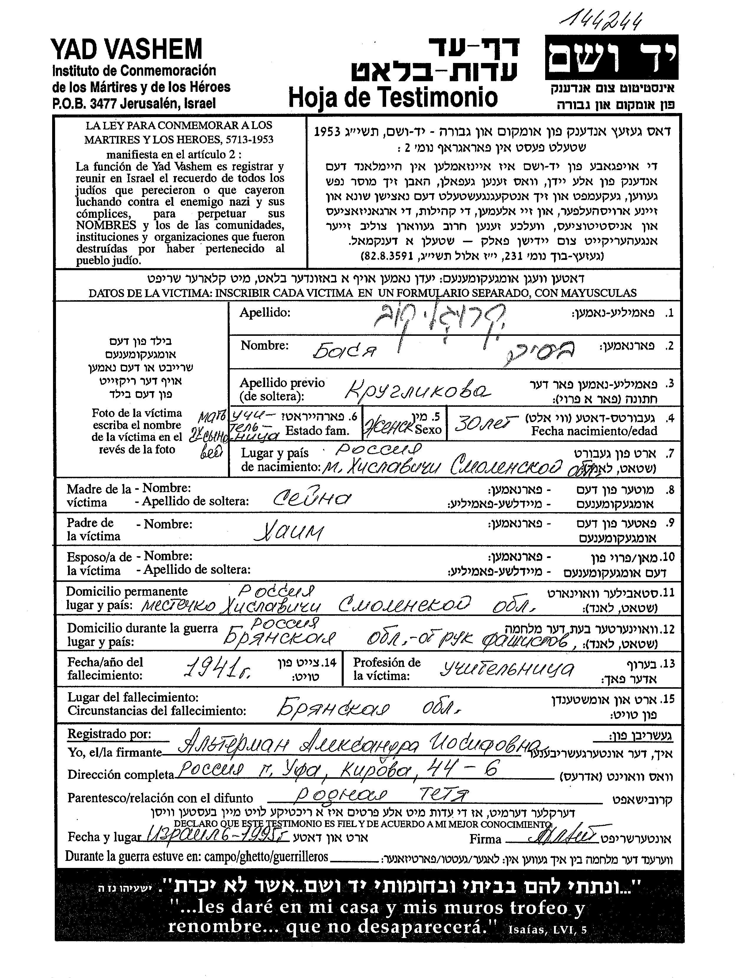 Basia Kruglikov wurde im Jahr 1911 in Khislavichi, Russland (UdSSR) geboren. Sie war die Tochter von Khaim und Seina. Sie war Lehrer/in und Verheiratet. Vor dem Zweiten Weltkrieg lebte sie in Khislavichi, Russland (UdSSR). Während des Krieges war sie in Orel, Russland (UdSSR).