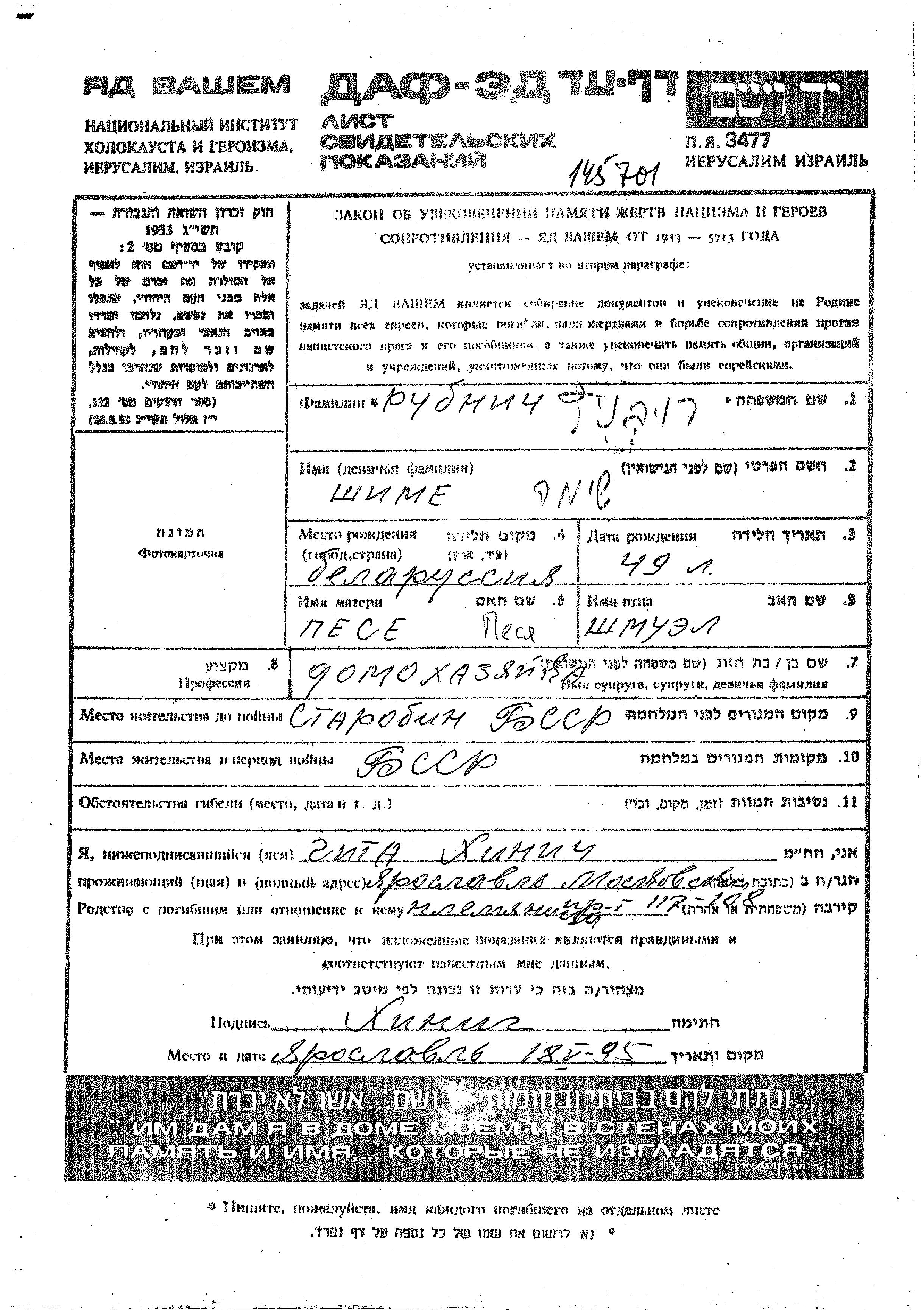 Shime Rubnich wurde in Weißrussland (UdSSR) geboren. Sie war die Tochter von Shmuel und Pese. Sie war Hausfrau. Vor dem Zweiten Weltkrieg lebte sie in Starobin, Weißrussland (UdSSR). Während des Krieges war sie in Weißrussland (UdSSR).