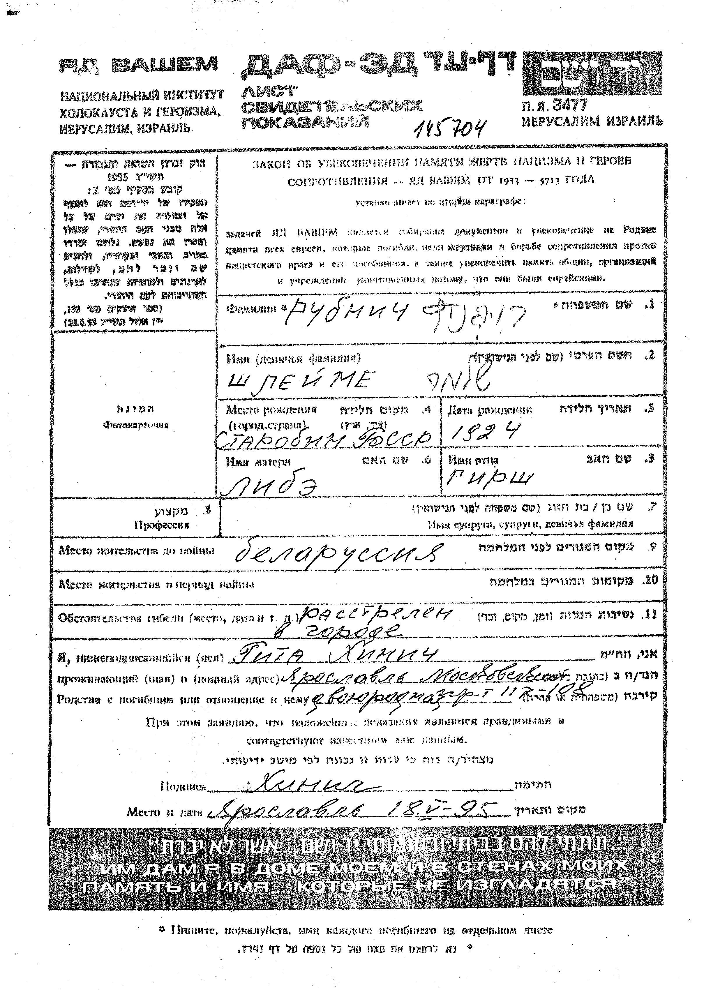 Shleime Rubnich wurde im Jahr 1924 in Starobin, Weißrussland (UdSSR) geboren. Er war der Sohn von Hirsh und Liba. Vor dem Zweiten Weltkrieg lebte er in Starobin, Weißrussland (UdSSR).