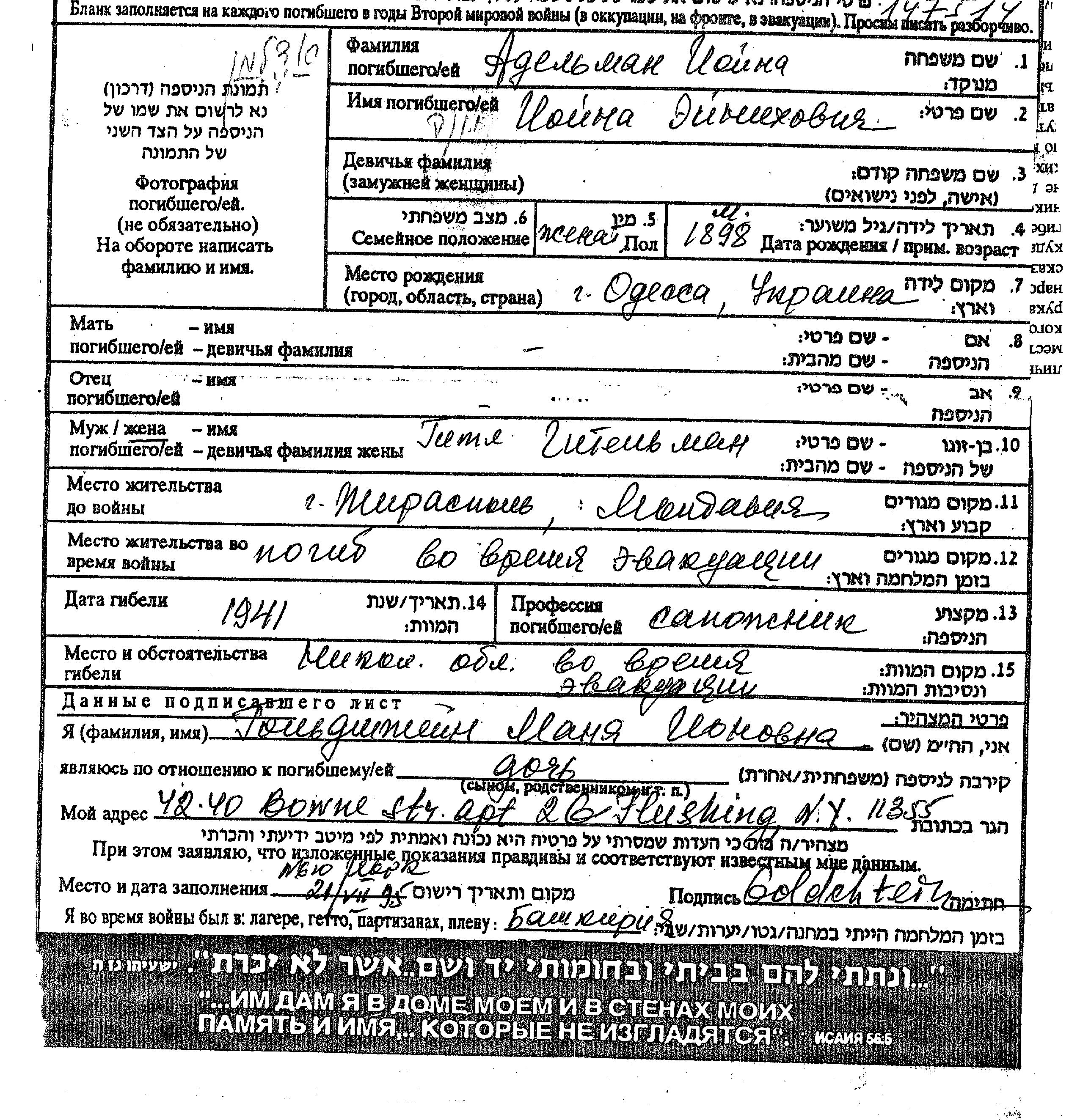 Yoyna Adelman wurde im Jahr 1898 in Odessa, Ukraine (UdSSR) geboren. Er war Schuster/-in und mit Gitl Verheiratet. Während des Krieges war er in Ukraine (UdSSR).