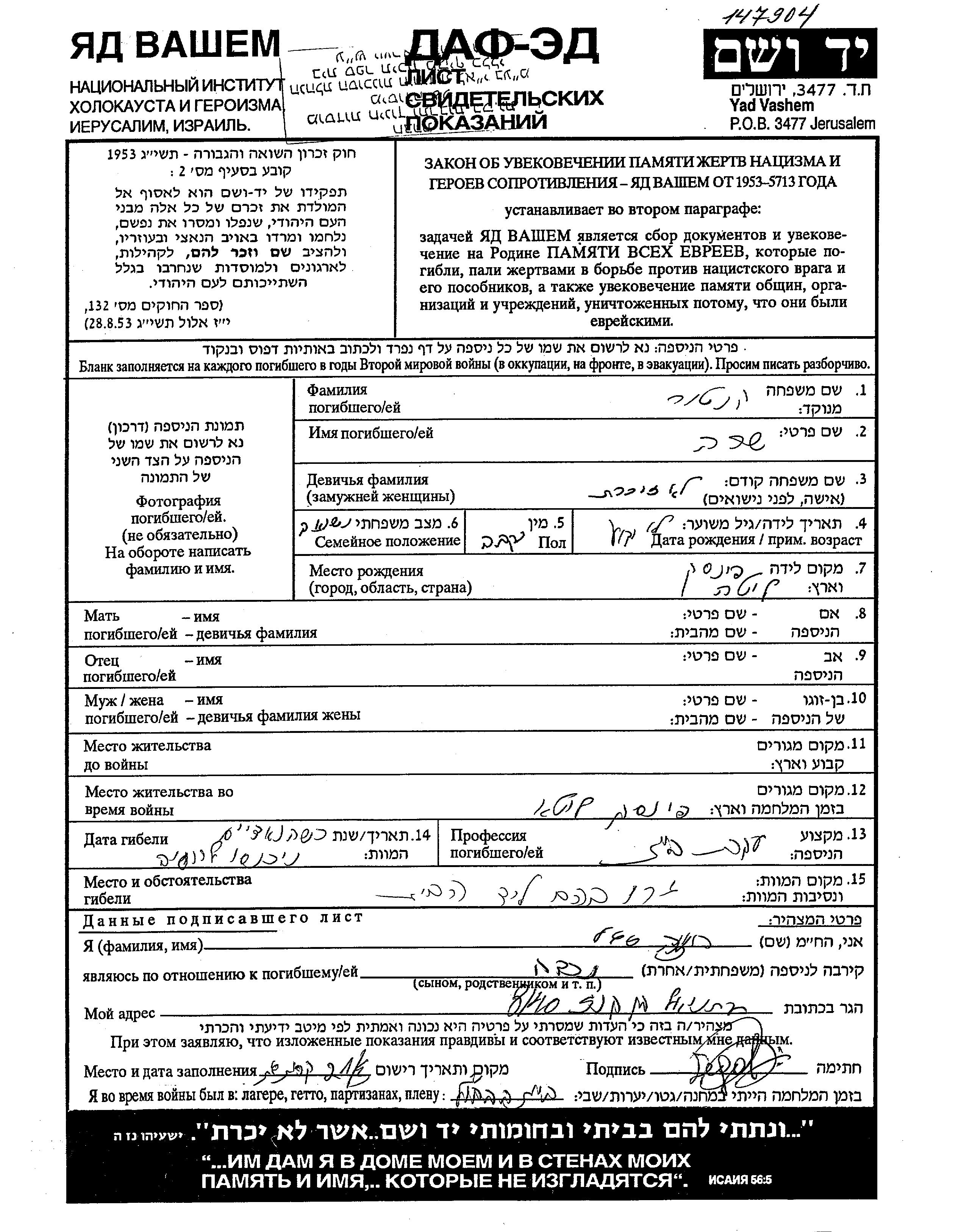 Sara wurde in der Schoah ermordet. Todesort: Pinsk, Polen im Jahr 1941.