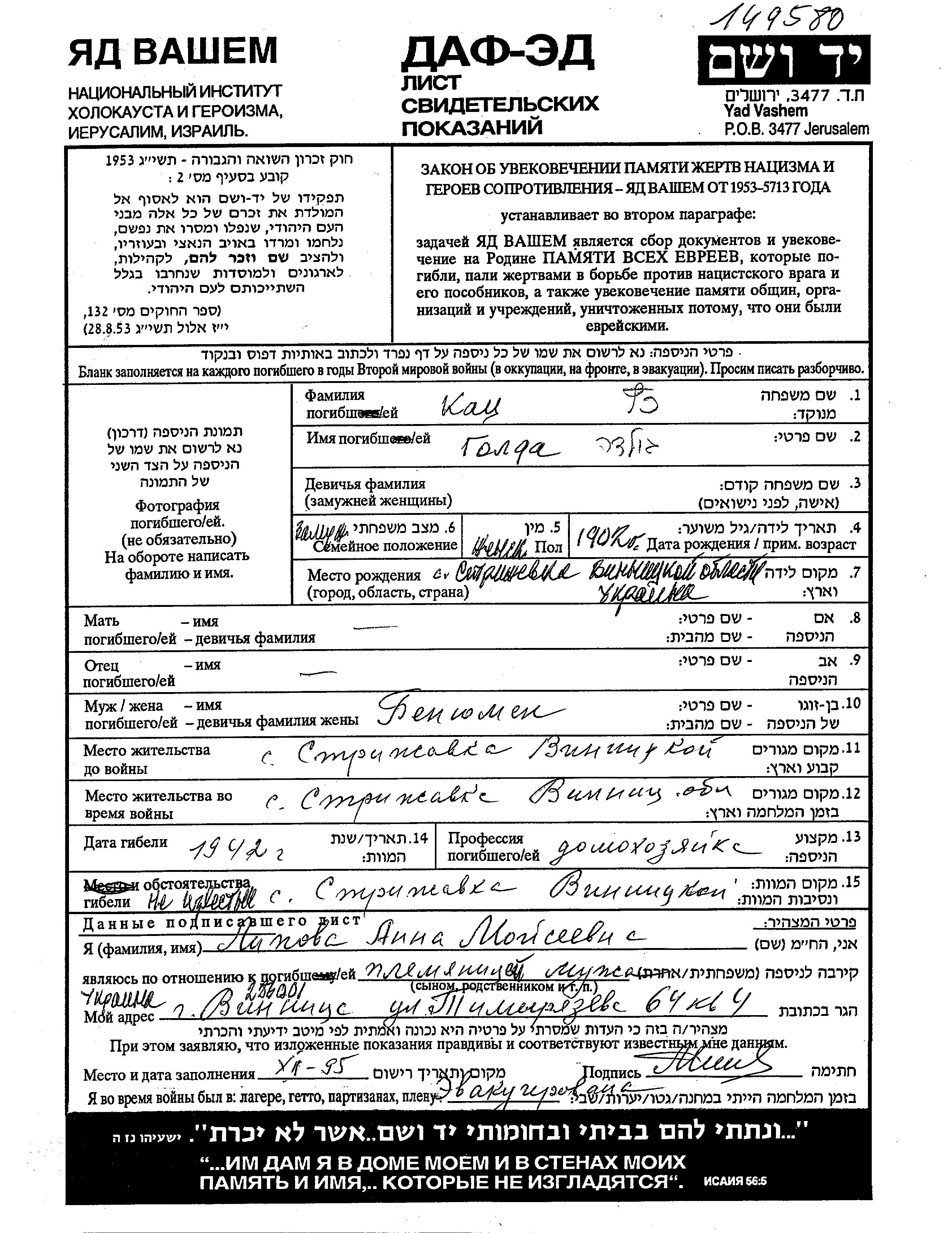 Golda Katz wurde im Jahr 1902 in Strizhevka, Ukraine (UdSSR) geboren. Sie war Hausfrau und mit Benyumen Verheiratet. Vor dem Zweiten Weltkrieg lebte sie in Strizhevka, Ukraine (UdSSR). Während des Krieges war sie in Strizhevka, Ukraine (UdSSR).