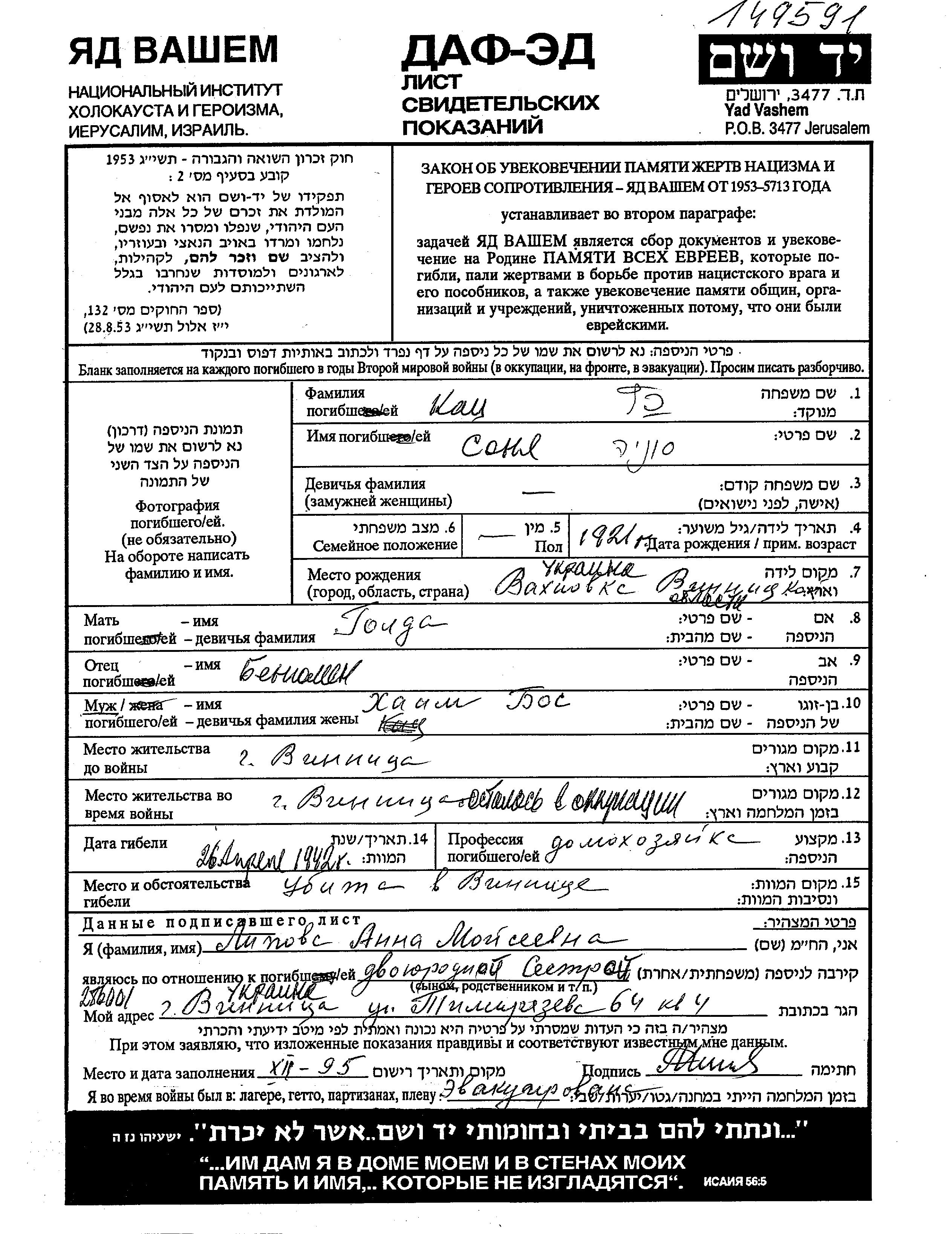 Sonia Katz wurde im Jahr 1921 in Vakhnovka, Ukraine (UdSSR) geboren. Sie war die Tochter von Benyumen und Golda. Sie war mit Khaim Verheiratet. Vor dem Zweiten Weltkrieg lebte sie in Vinnitsa, Ukraine (UdSSR). Während des Krieges war sie in Vinnitsa, Ukraine (UdSSR).