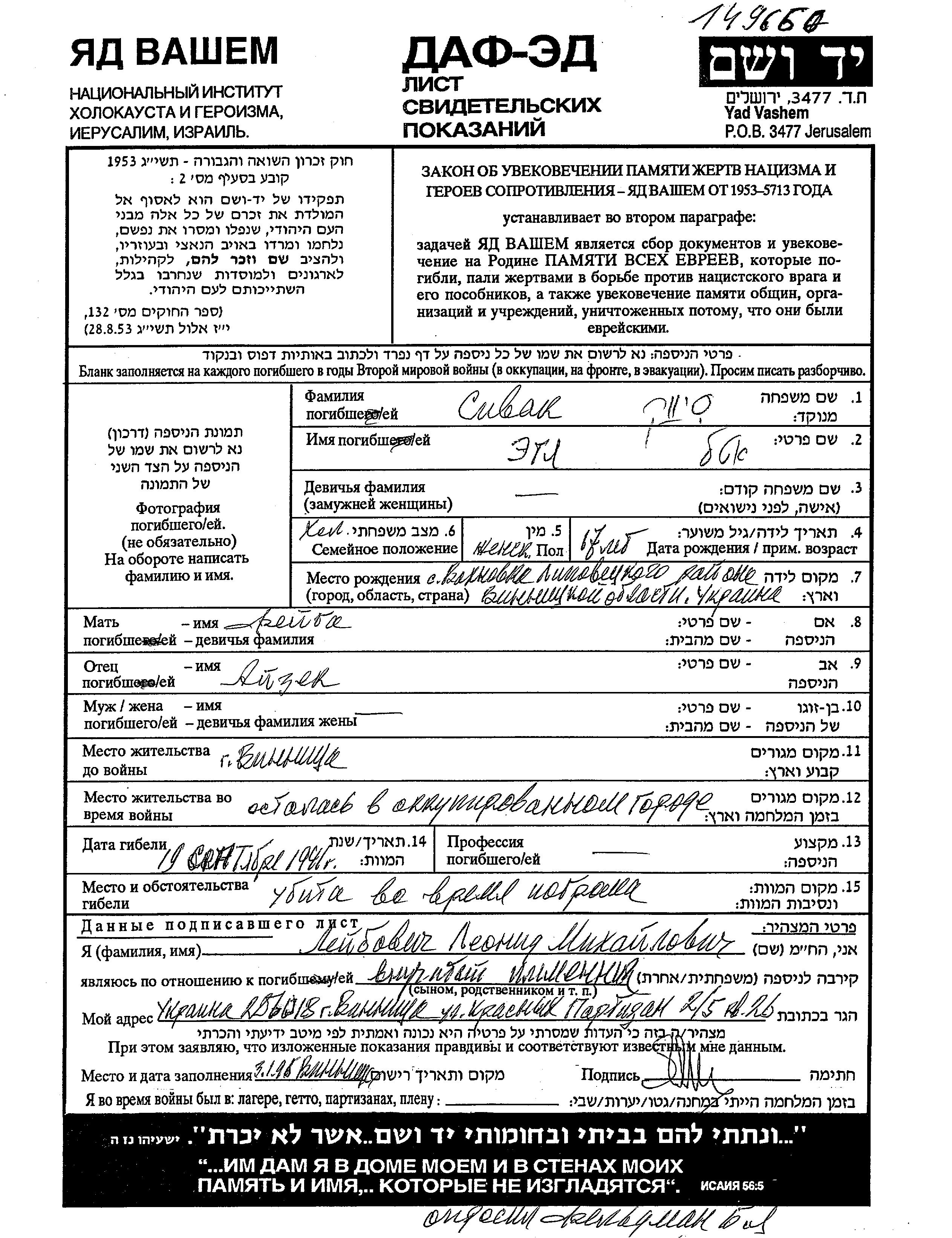 Etl Sivak wurde im Jahr 1924 in Vakhnovka, Ukraine (UdSSR) geboren. Sie war die Tochter von Aizek und Feiga. Sie war Kind. Vor dem Zweiten Weltkrieg lebte sie in Vinnitsa, Ukraine (UdSSR). Während des Krieges war sie in Vinnitsa, Ukraine (UdSSR).