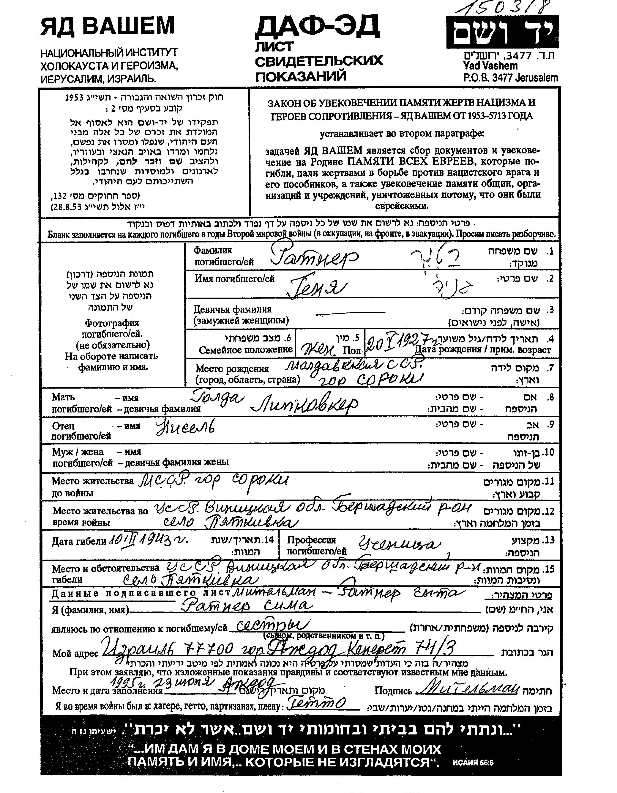 Genia wurde in der Schoah ermordet. Todesort: Pyatkovka, Ukraine (UdSSR) im Jahr 10/03/1943.