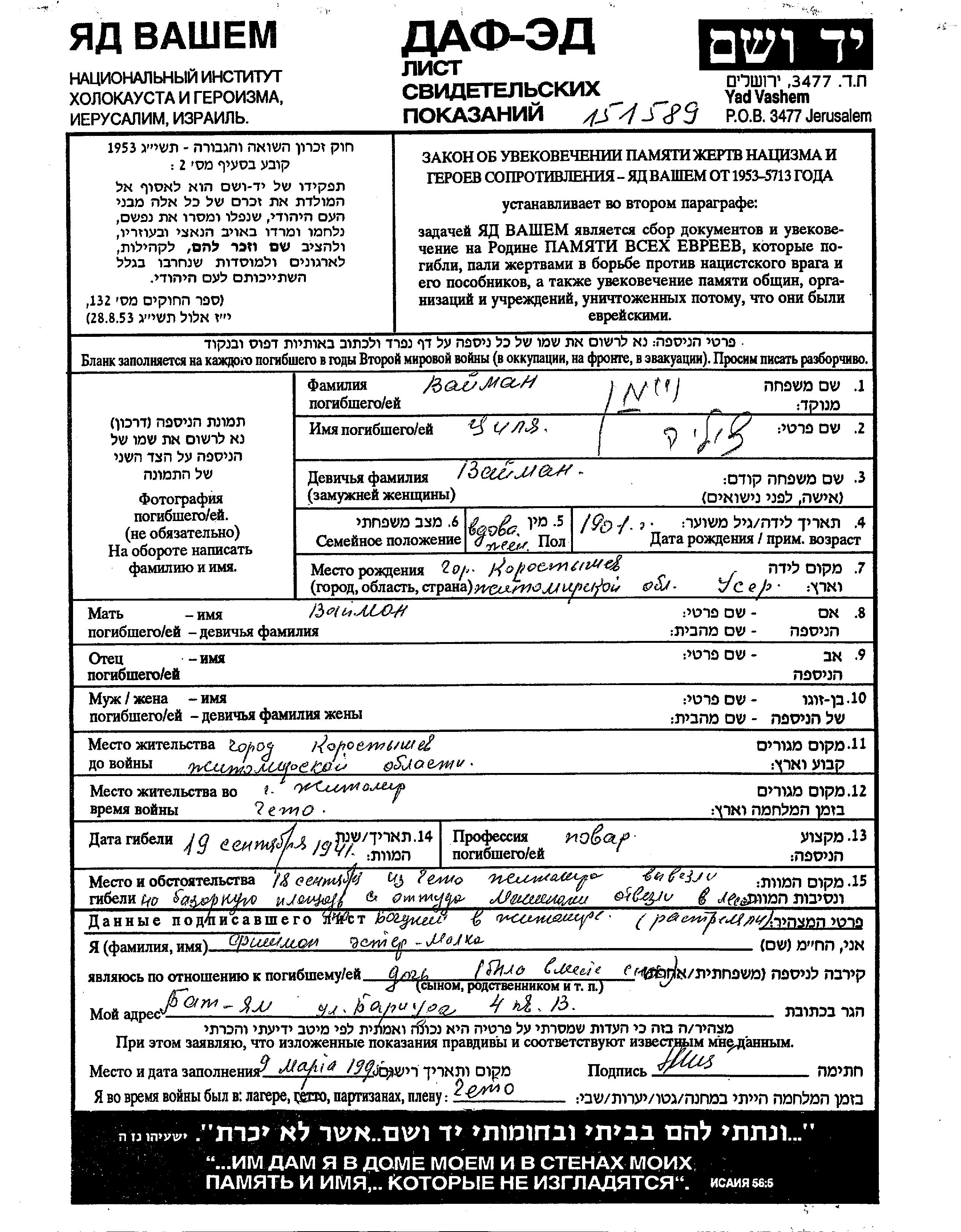 Tzilia Vaiman, geb. Vaiman wurde im Jahr 1901 in Korostyshev, Ukraine (UdSSR) geboren. Sie war Koch und Verwitwet. Vor dem Zweiten Weltkrieg lebte sie in Korostyshev, Ukraine (UdSSR). Während des Krieges war sie in Zhitomir, Ukraine (UdSSR).