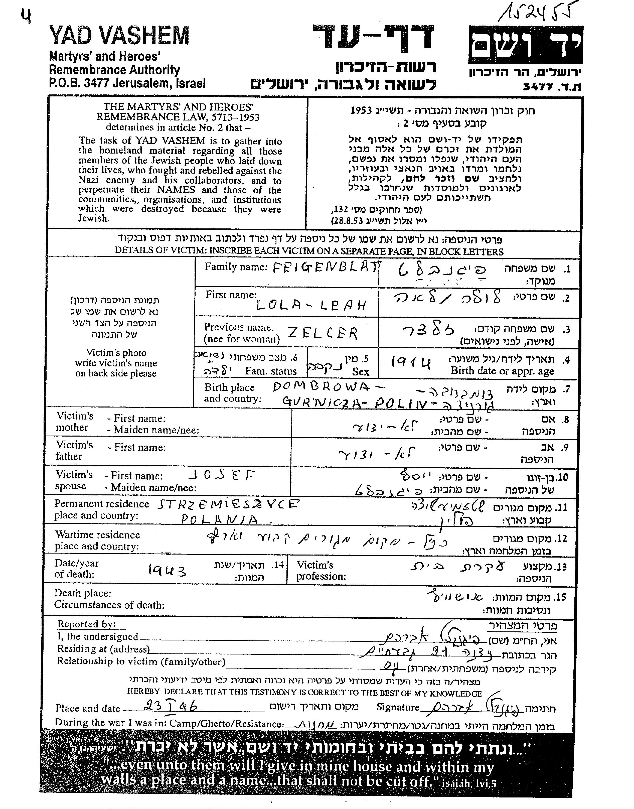 Leah Lola Feigenblat, geb. Zelcer wurde im Jahr 1914 geboren. Sie war Hausfrau und mit Josef Verheiratet. Vor dem Zweiten Weltkrieg lebte sie in Strzemieszyce, Polen. Während des Krieges war sie in Strzemieszyce, Polen.