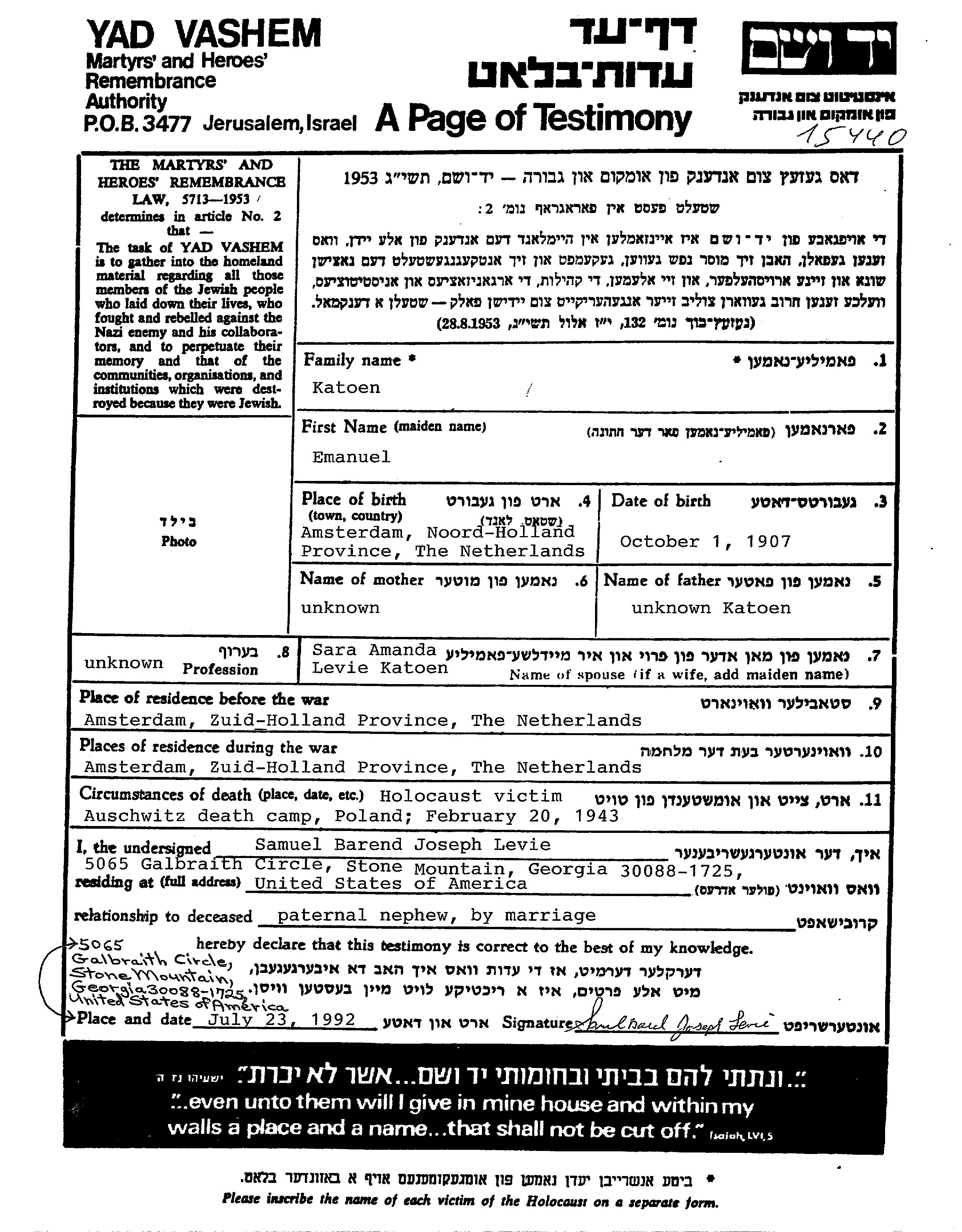 Emanuel Katoen wurde im Jahr 1907 in Amsterdam, Niederlande geboren. Er war mit Sara Amanda Verheiratet. Vor dem Zweiten Weltkrieg lebte er in Amsterdam, Niederlande. Während des Krieges war er in Amsterdam, Niederlande.