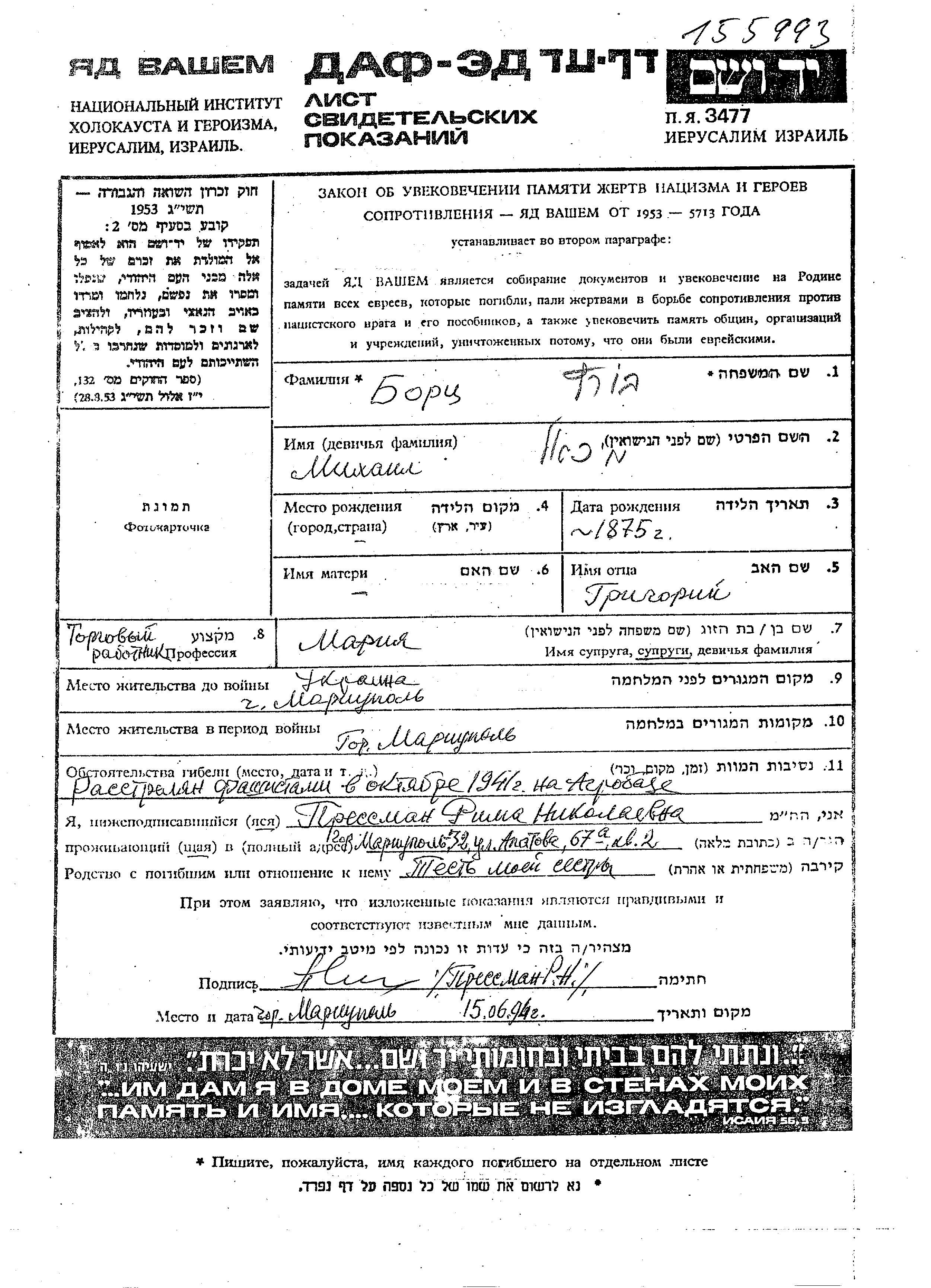 Vorname unbekannt Bortz wurde im Jahr 1875 in Ukraine (UdSSR) geboren. Er war der Sohn von Grigori. Er war Verkäufer/-in und mit Maria Verheiratet. Vor dem Zweiten Weltkrieg lebte er in Mariupol, Ukraine (UdSSR). Während des Krieges war er in Mariupol, Ukraine (UdSSR).