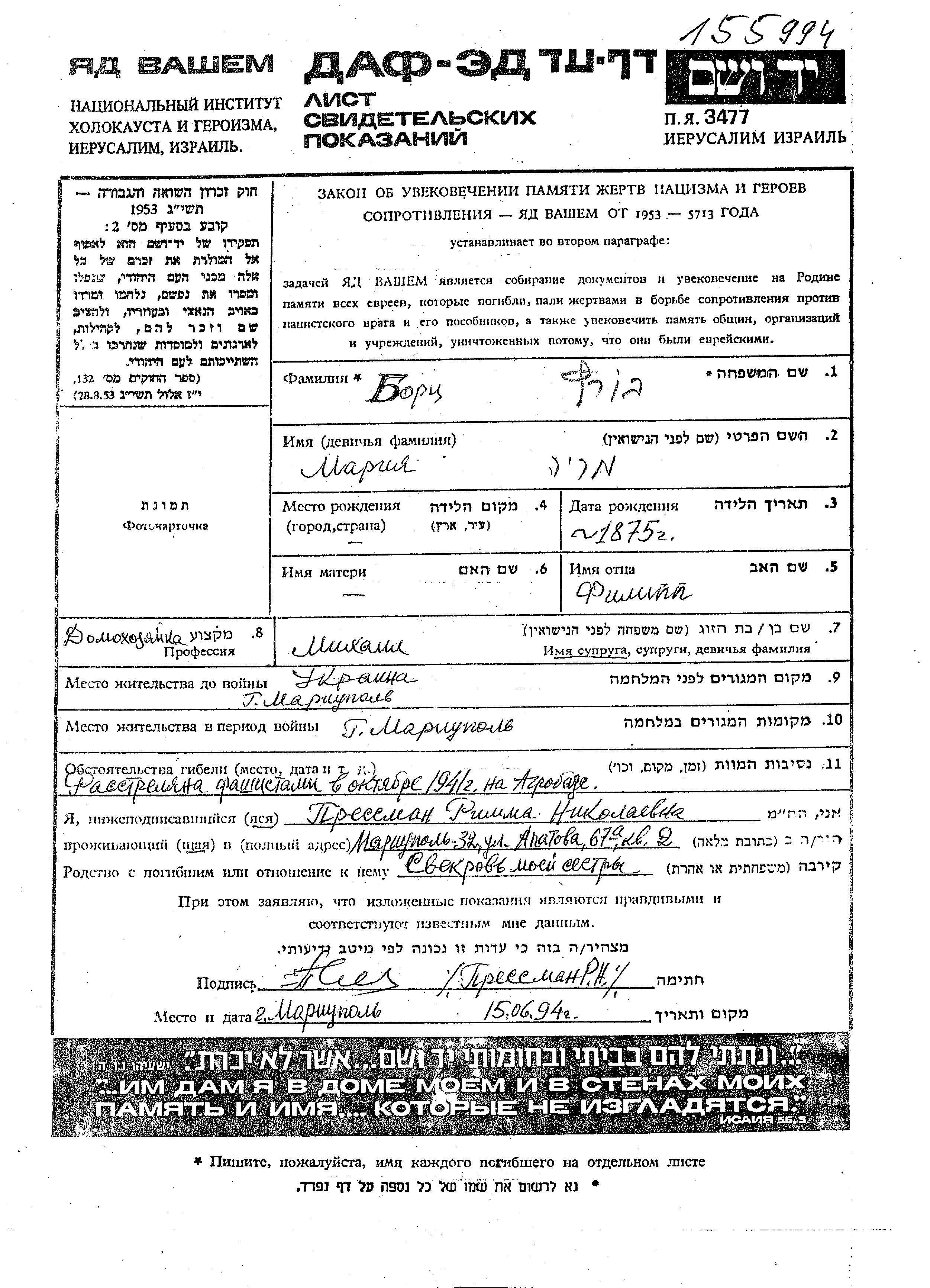 Bortz Maria 1875 Mariupol, Ukraine (UdSSR) Gedenkblatt
