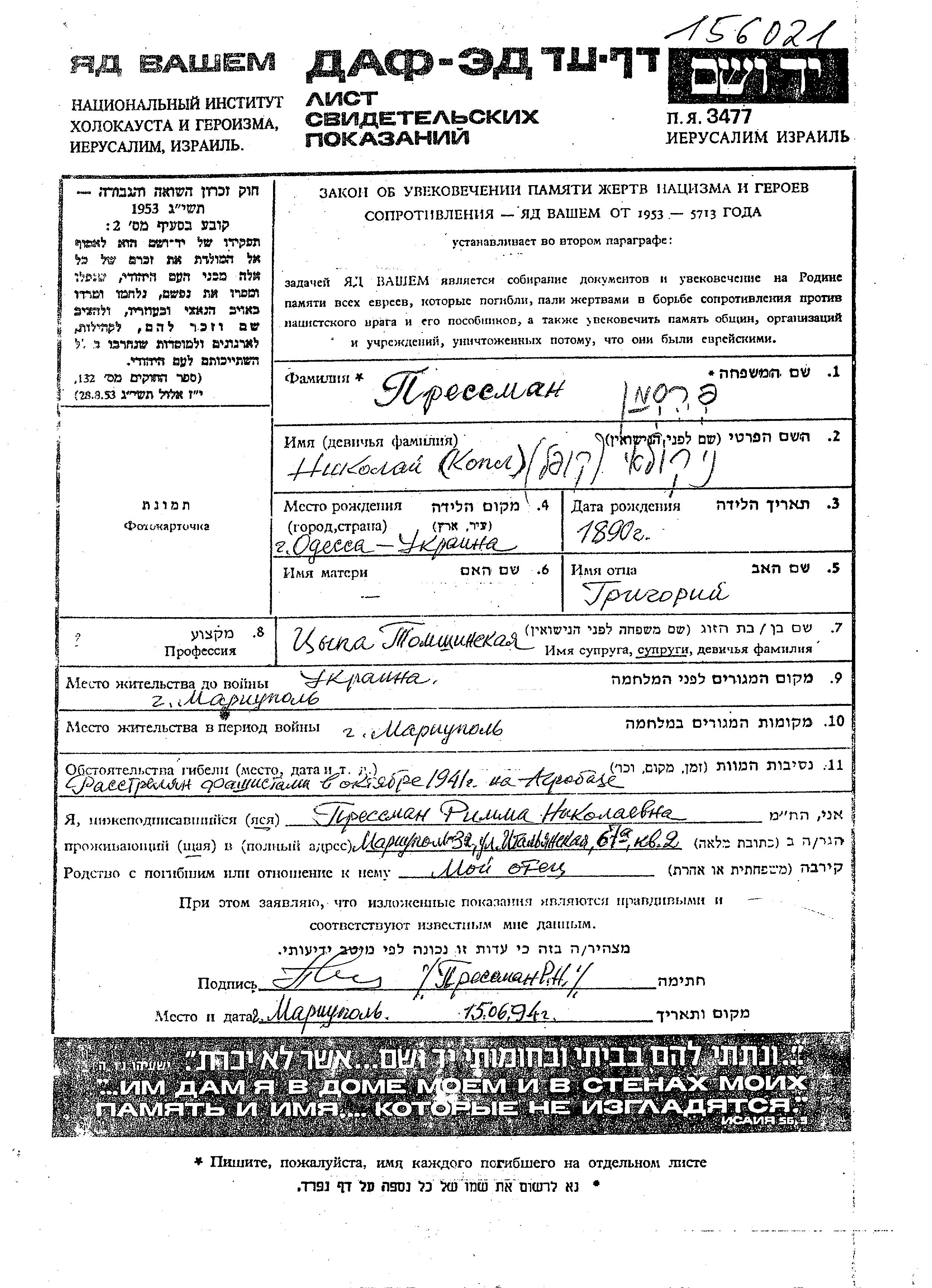 Nikolai Kopl Presman wurde im Jahr 1890 in Odessa, Ukraine (UdSSR) geboren. Er war der Sohn von Grigori. Er war mit Tzipa Verheiratet. Vor dem Zweiten Weltkrieg lebte er in Mariupol, Ukraine (UdSSR). Während des Krieges war er in Mariupol, Ukraine (UdSSR).