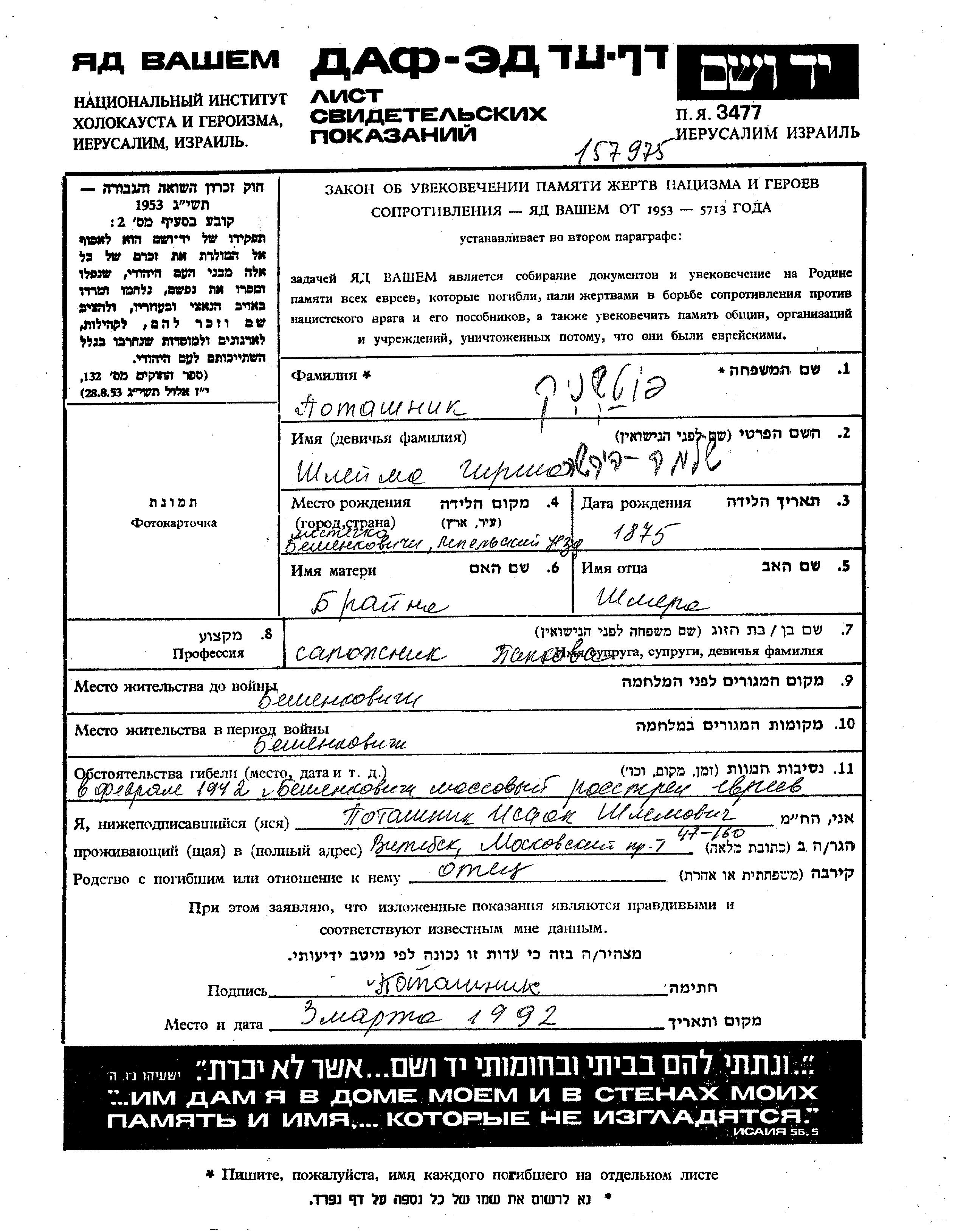 Shleima Girsha Potashnik wurde im Jahr 1875 in Beshenkowitschi, Weißrussland (UdSSR) geboren. Er war der Sohn von Shmera und Braina. Er war Verheiratet. Vor dem Zweiten Weltkrieg lebte er in Beshenkowitschi, Weißrussland (UdSSR). Während des Krieges war er in Beshenkowitschi, Weißrussland (UdSSR).