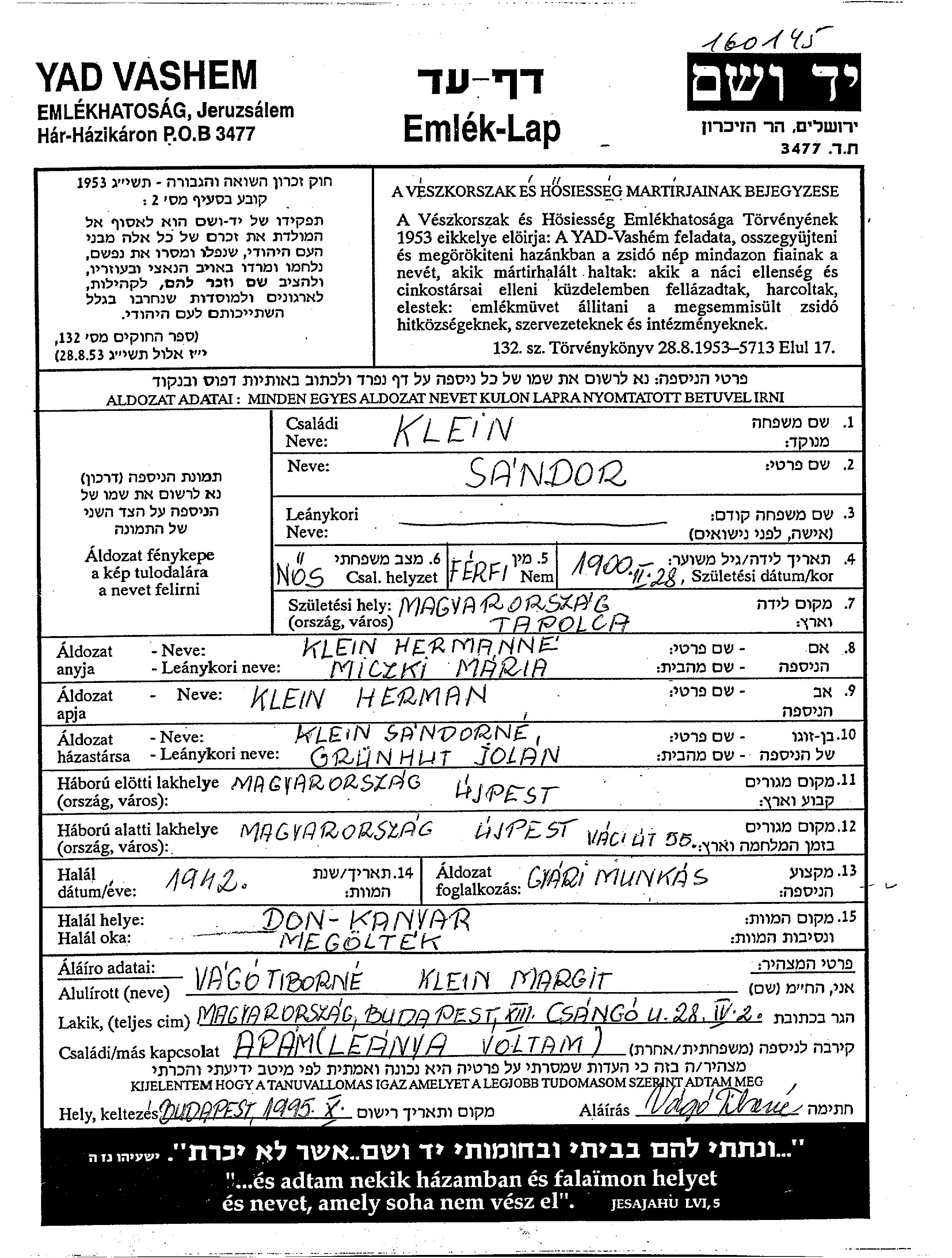 Sandor Klein wurde im Jahr 1900 in Tapolca, Ungarn geboren. Er war der Sohn von Herman und Maria, geb. Miczki. Er war Arbeiter/-in und mit Jolan, geb. Grünhut Verheiratet. Vor dem Zweiten Weltkrieg lebte er in Ujpest, Ungarn. Während des Krieges war er in Ujpest, Ungarn.