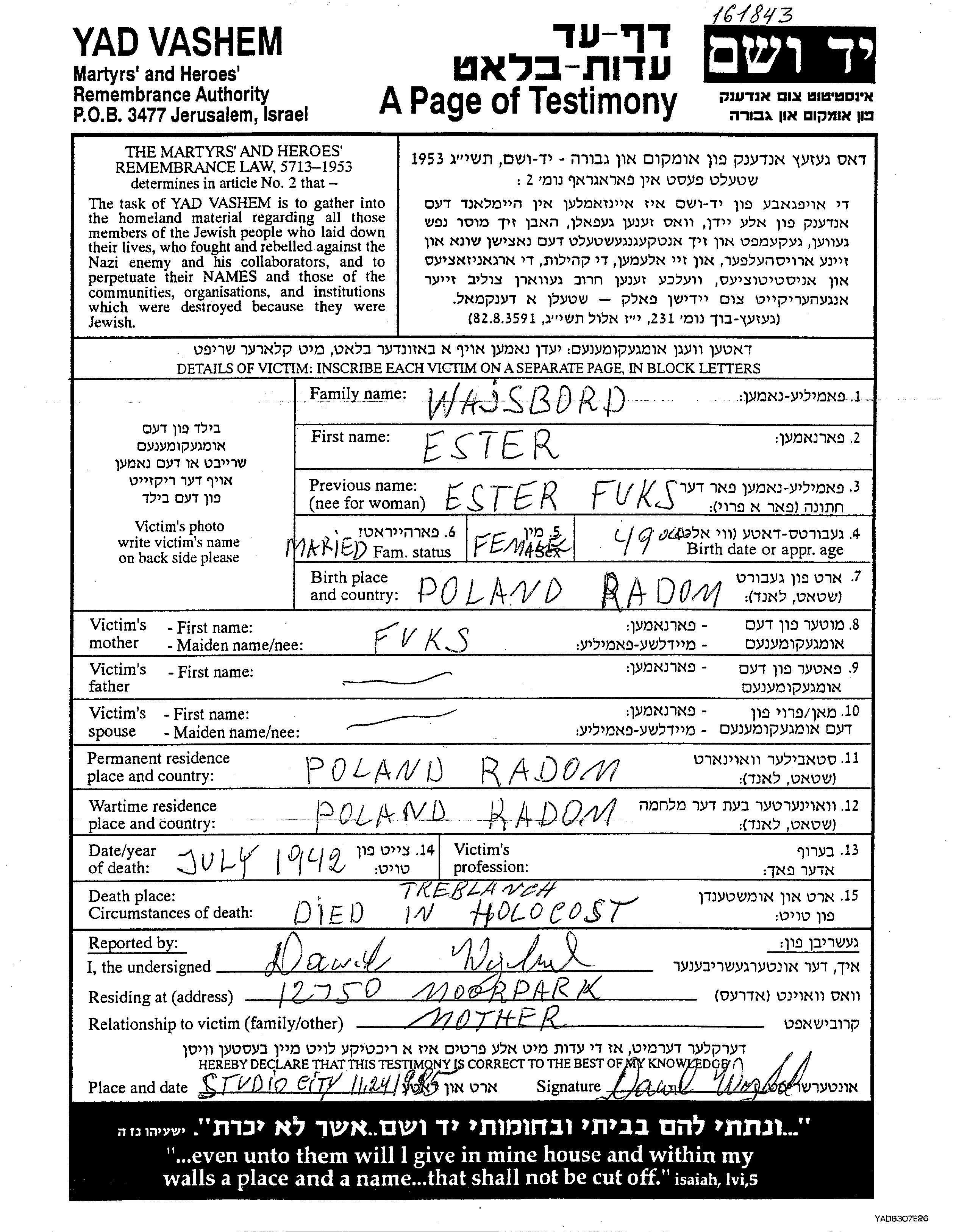 Ester Wajsbord, geb. Fuks wurde im Jahr 1893 in Radom, Polen geboren. Sie war mit Mojshe Verheiratet. Vor dem Zweiten Weltkrieg lebte sie in Radom, Polen. Während des Krieges war sie in Radom, Polen.