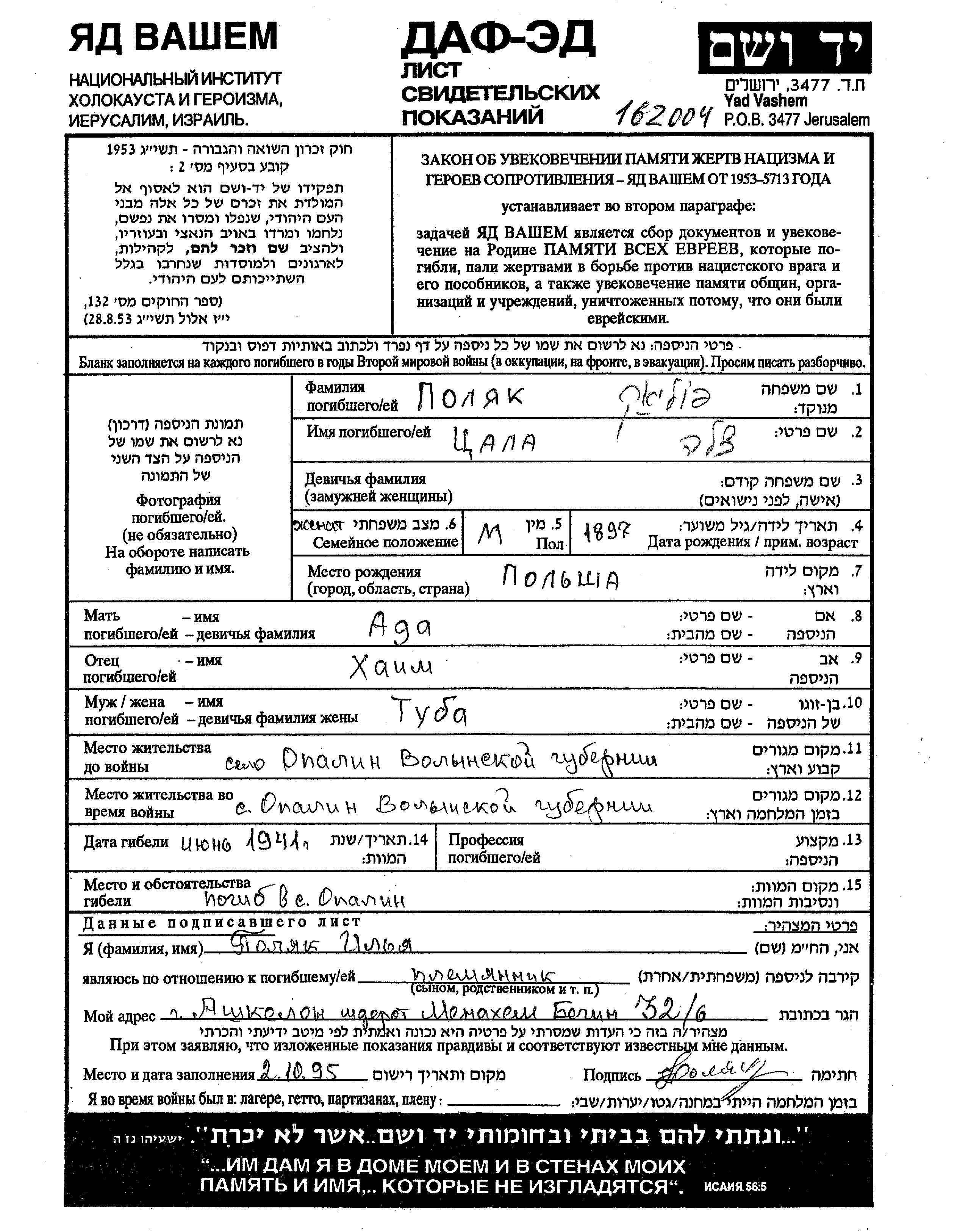 Tzala Tzila Polyak wurde im Jahr 1897 in Polen geboren. Er war der Sohn von Khaim und Ede Ada. Er war mit Tuba Tova Verheiratet. Vor dem Zweiten Weltkrieg lebte er in Opalin, Polen. Während des Krieges war er in Opalin, Polen.