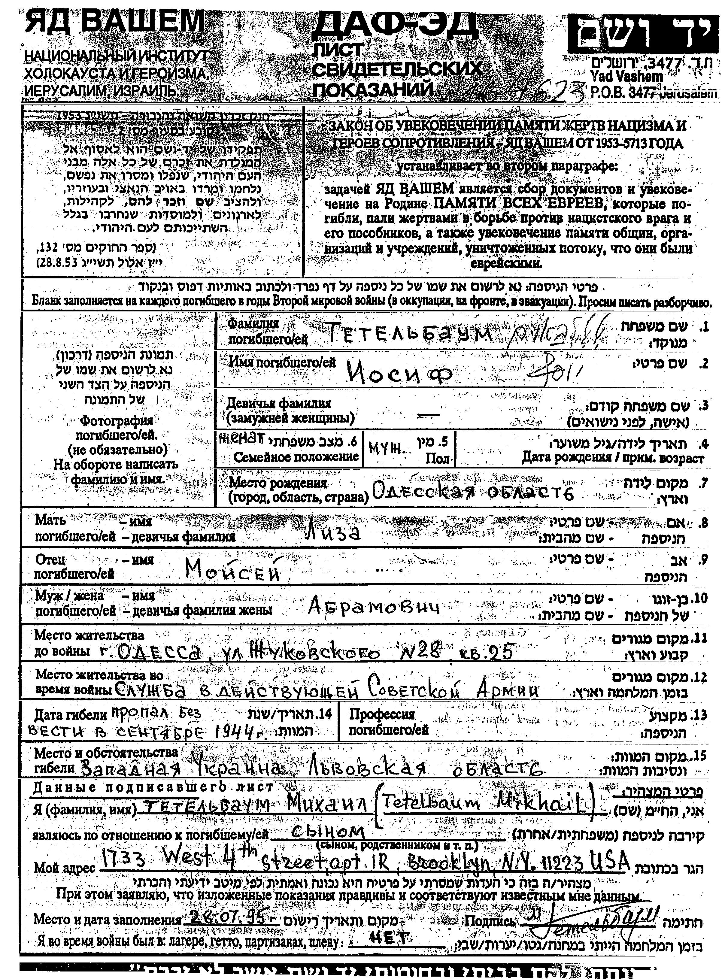 Iosif Tetelbaum wurde in Odessa, Ukraine (UdSSR) geboren. Er war der Sohn von Moisei und Liza. Er war Verheiratet. Vor dem Zweiten Weltkrieg lebte er in Odessa, Ukraine (UdSSR). Während des Krieges war er in die Sowjetischen Streitkräfte.