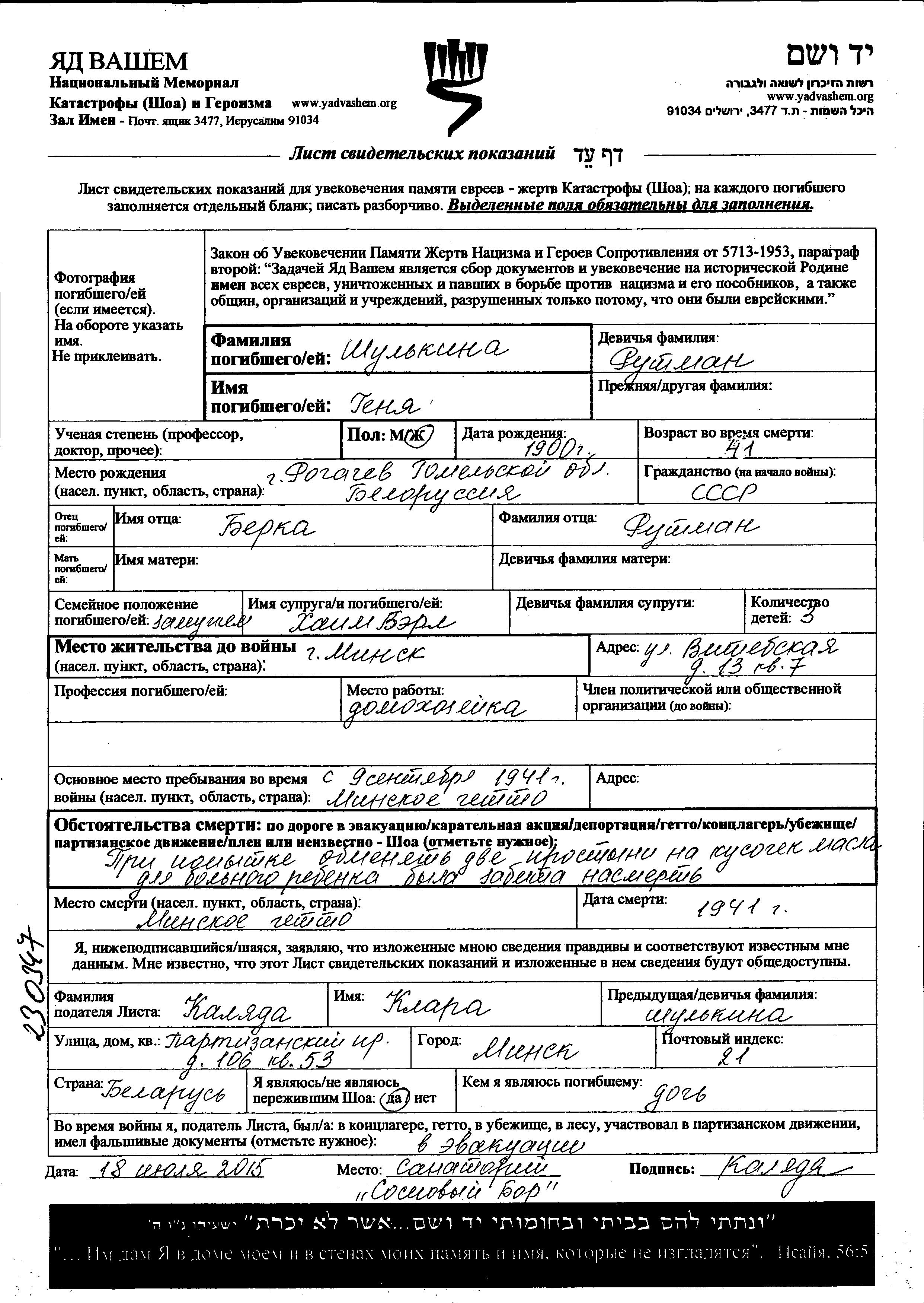 Genya Shulkina, geb. Rutman wurde im Jahr 1900 in Rogachev, Weißrussland (UdSSR) geboren. Sie war die Tochter von Berka. Sie war Hausfrau und mit Khaim Berl Verheiratet. Vor dem Zweiten Weltkrieg lebte sie in Minsk, Weißrussland (UdSSR). Während des Krieges war sie in Minsk, Weißrussland (UdSSR).
