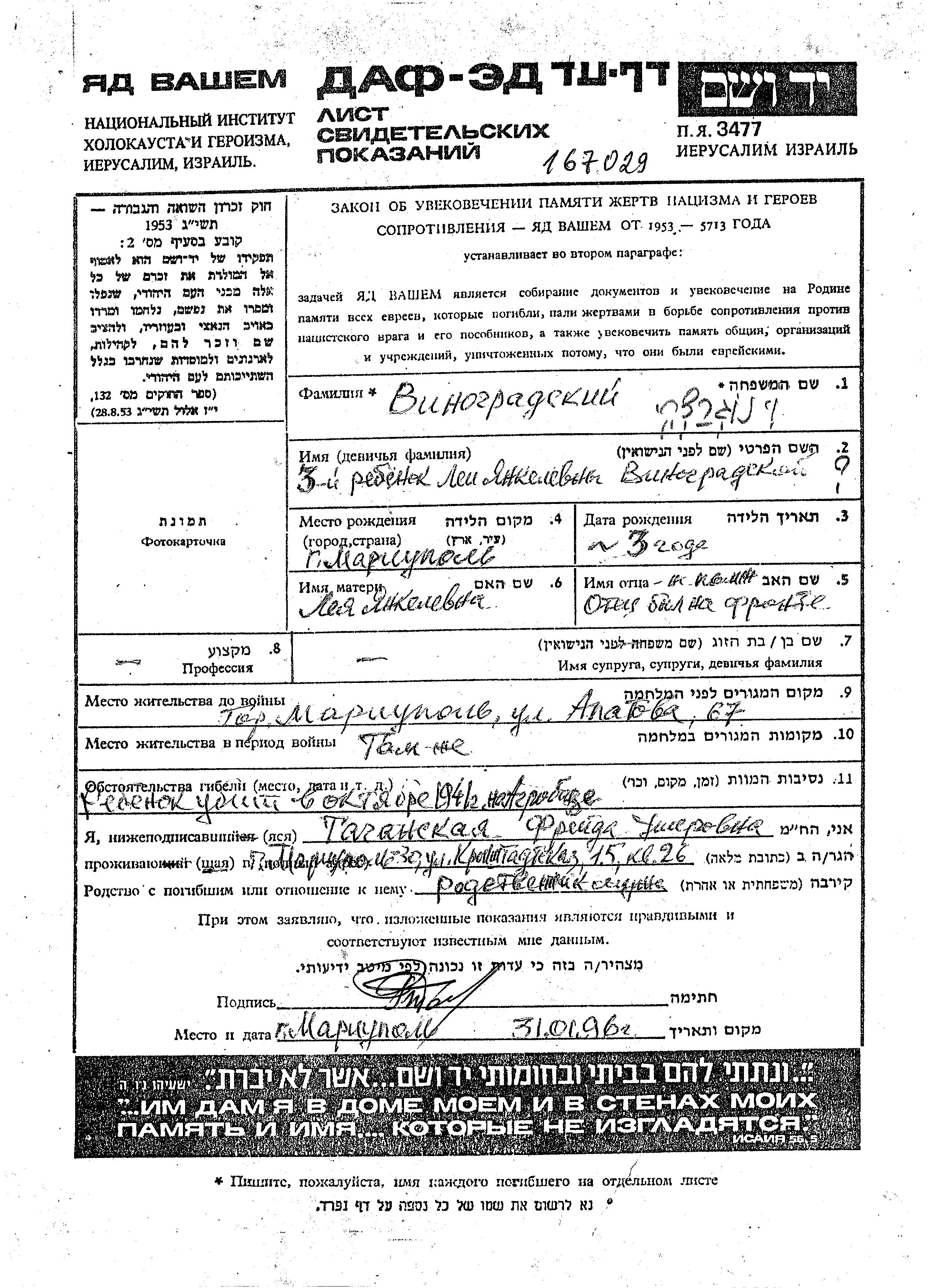 Vorname unbekannt Vinogradski wurde im Jahr 1938 in Mariupol, Ukraine (UdSSR) geboren. Er war der Sohn von Lea. Er war Kind. Vor dem Zweiten Weltkrieg lebte er in Mariupol, Ukraine (UdSSR). Während des Krieges war er in Mariupol, Ukraine (UdSSR).