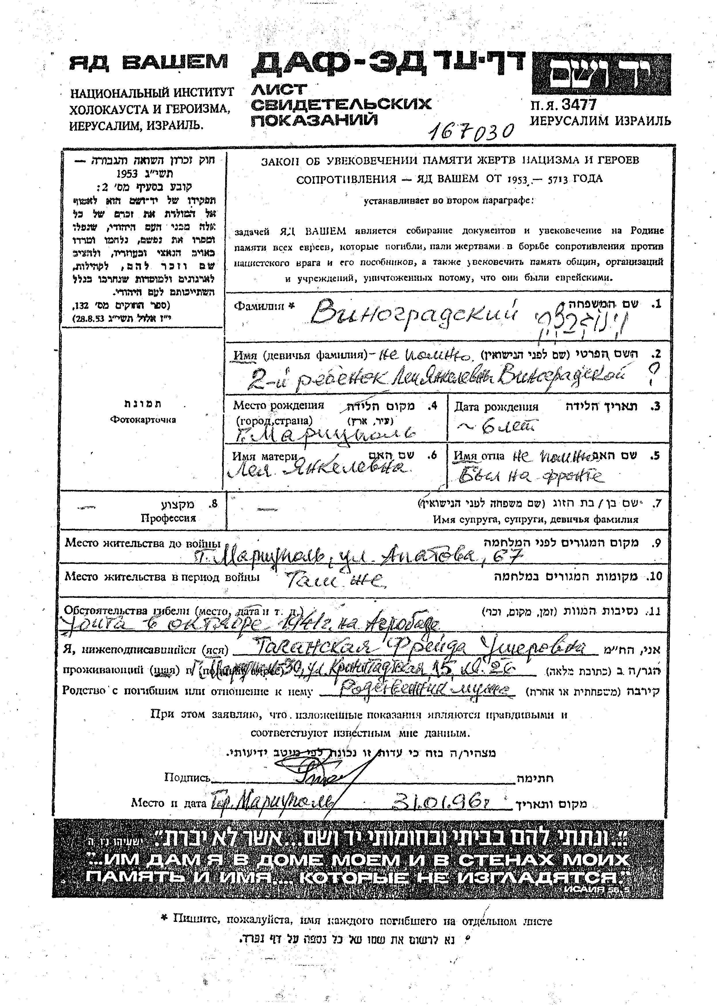 Vorname unbekannt Vinogradski wurde im Jahr 1935 in Mariupol, Ukraine (UdSSR) geboren. Sie war die Tochter von Lea. Sie war Kind. Vor dem Zweiten Weltkrieg lebte sie in Mariupol, Ukraine (UdSSR). Während des Krieges war sie in Mariupol, Ukraine (UdSSR).