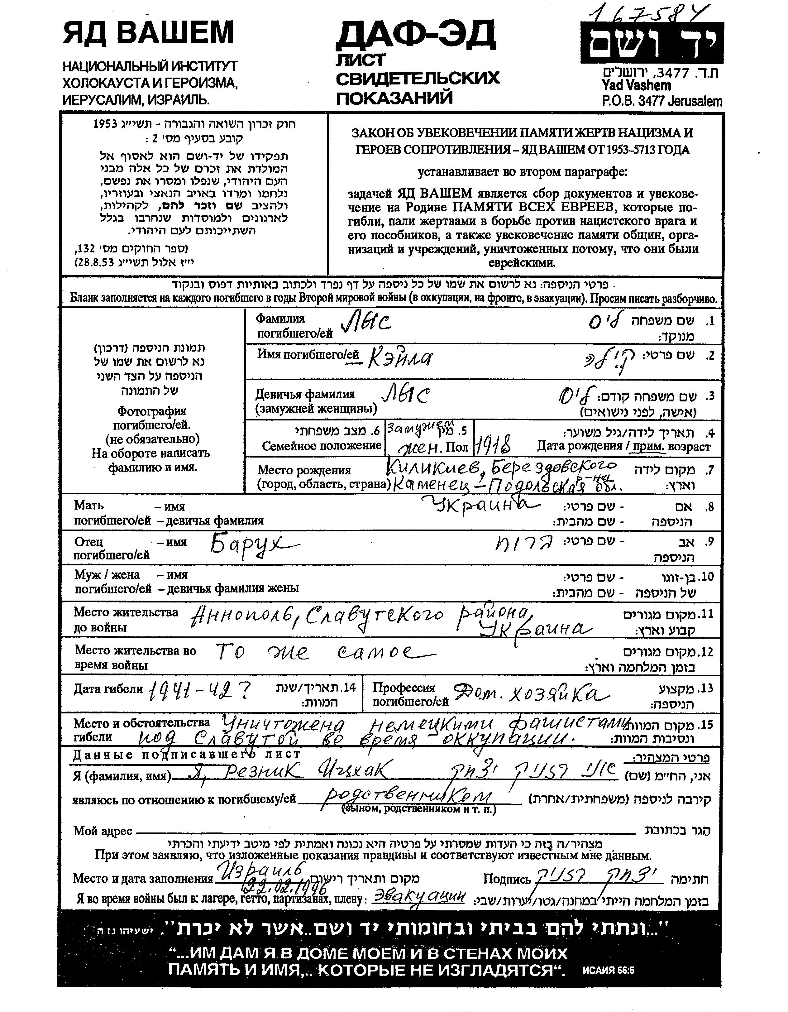 Keila Lys, geb. Lys wurde im Jahr 1918 in Kamenets Podolskiy, Ukraine (UdSSR) geboren. Sie war die Tochter von Barukh. Sie war Hausfrau und Verheiratet. Vor dem Zweiten Weltkrieg lebte sie in Annopol, Ukraine (UdSSR). Während des Krieges war sie in Annopol, Ukraine (UdSSR).