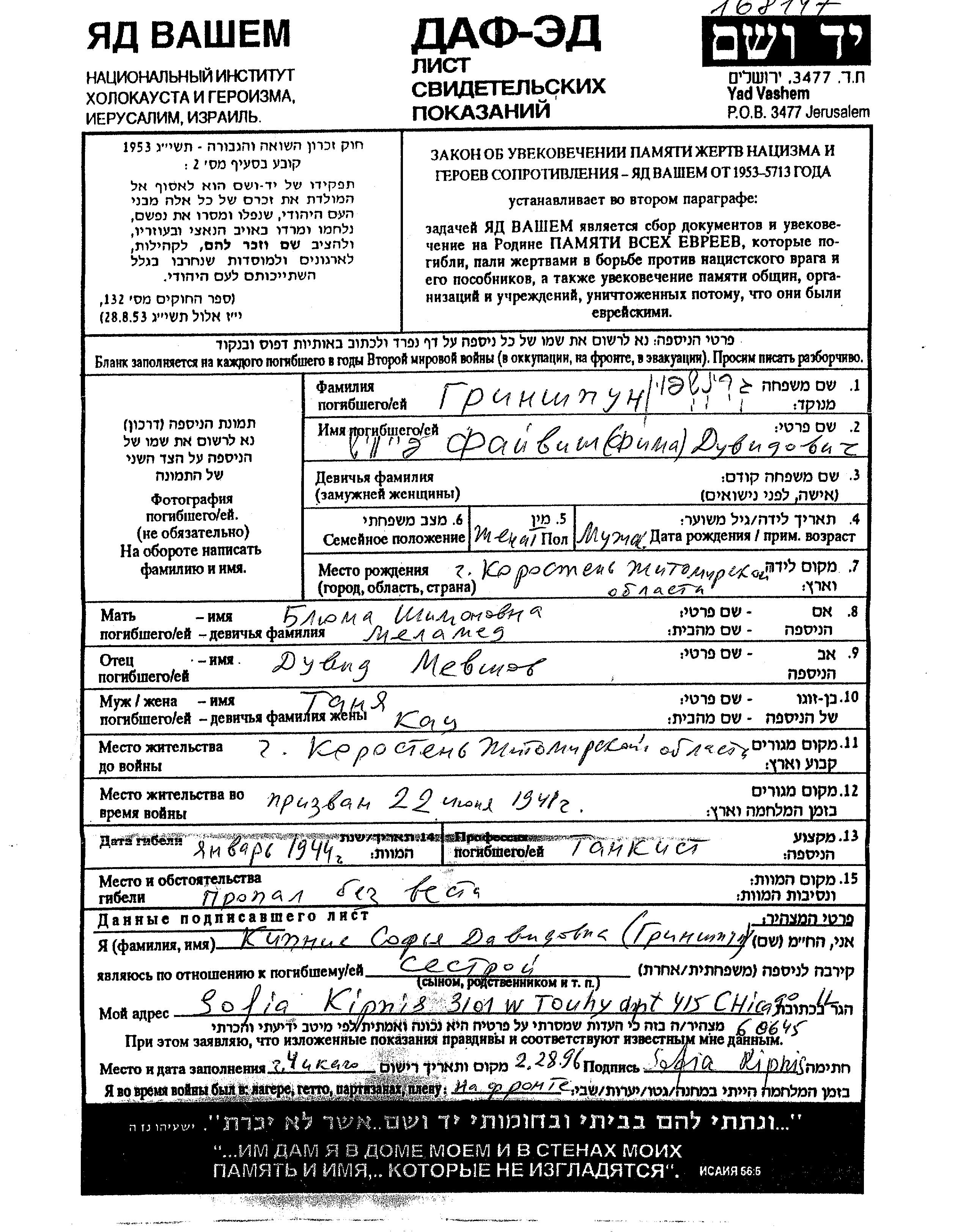 Grinshpun Faivish Fima Korosten, Ukraine (UdSSR) Gedenkblatt