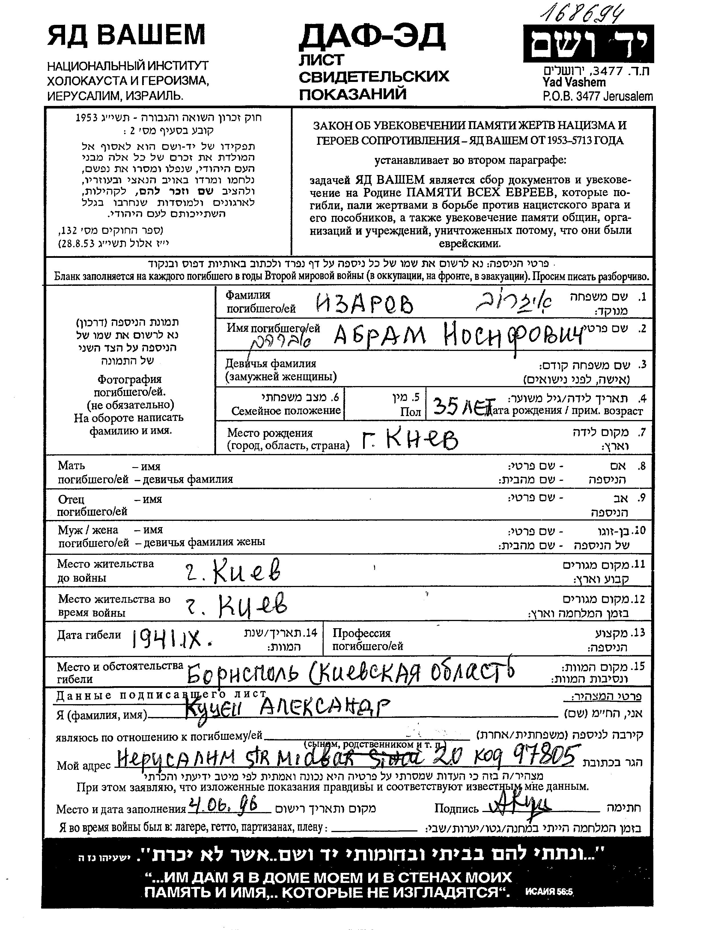 Abram Izarov wurde im Jahr 1906 in Kiyev, Ukraine (UdSSR) geboren. Vor dem Zweiten Weltkrieg lebte er in Kiyev, Ukraine (UdSSR). Während des Krieges war er in Kiyev, Ukraine (UdSSR).