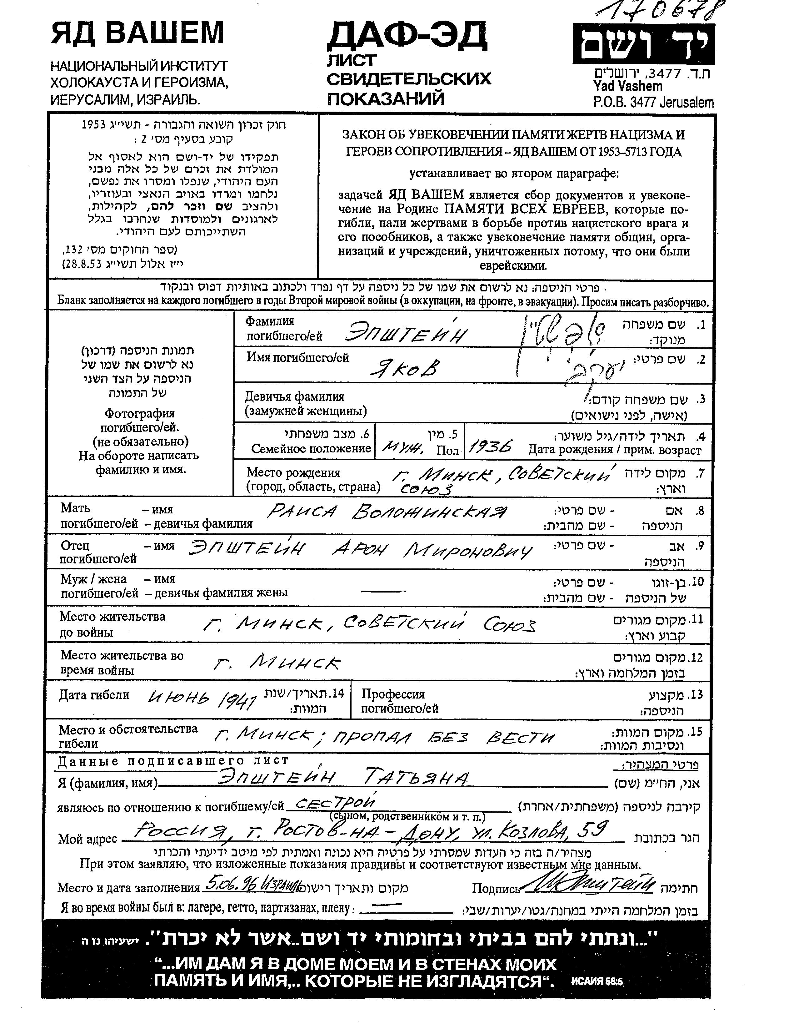 Yakov Epshtein wurde im Jahr 1936 in Minsk, Weißrussland (UdSSR) geboren. Er war der Sohn von Aron und Raisa, geb. Volozhinskaya. Er war Kind. Vor dem Zweiten Weltkrieg lebte er in Minsk, Weißrussland (UdSSR). Während des Krieges war er in Minsk, Weißrussland (UdSSR).