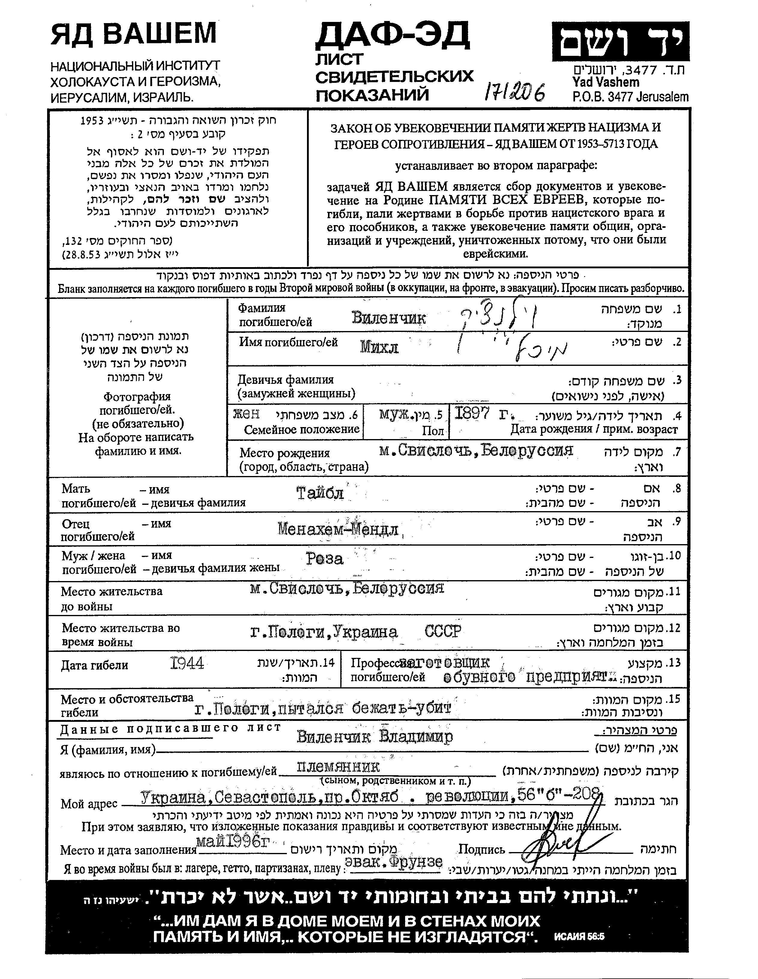 Mikhl Vilenchik wurde im Jahr 1897 in Svisloch, Weißrussland (UdSSR) geboren. Er war der Sohn von Menakhem Mendl und Taibl. Er war Schuster/-in und mit Roza Verheiratet. Vor dem Zweiten Weltkrieg lebte er in Svisloch, Weißrussland (UdSSR). Während des Krieges war er in Pologi, Ukraine (UdSSR).