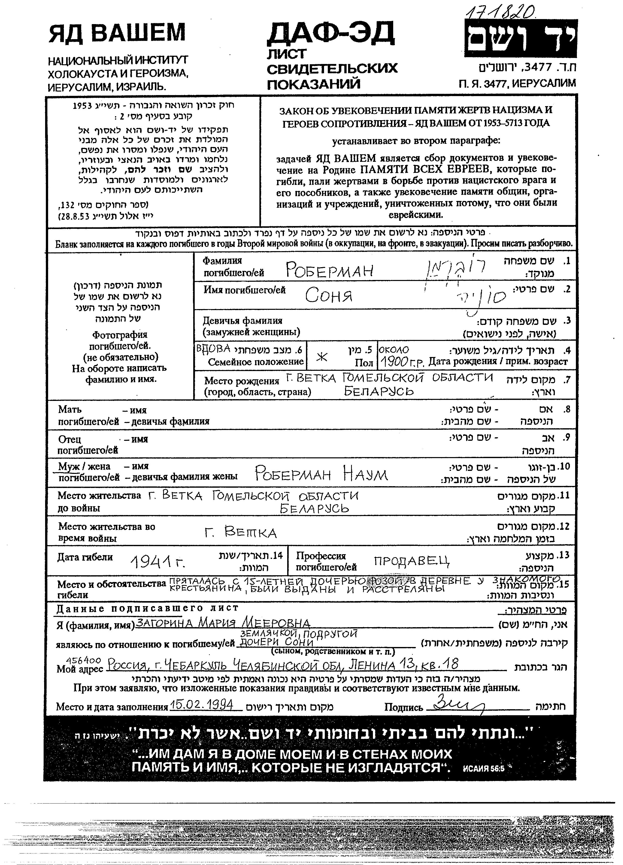 Roza Roberman wurde im Jahr 1926 in Vetka, Weißrussland (UdSSR) geboren. Sie war die Tochter von Nakhum und Sonya. Sie war Schüler/-in und Kind. Vor dem Zweiten Weltkrieg lebte sie in Vetka, Weißrussland (UdSSR). Während des Krieges war sie in Vetka, Weißrussland (UdSSR).