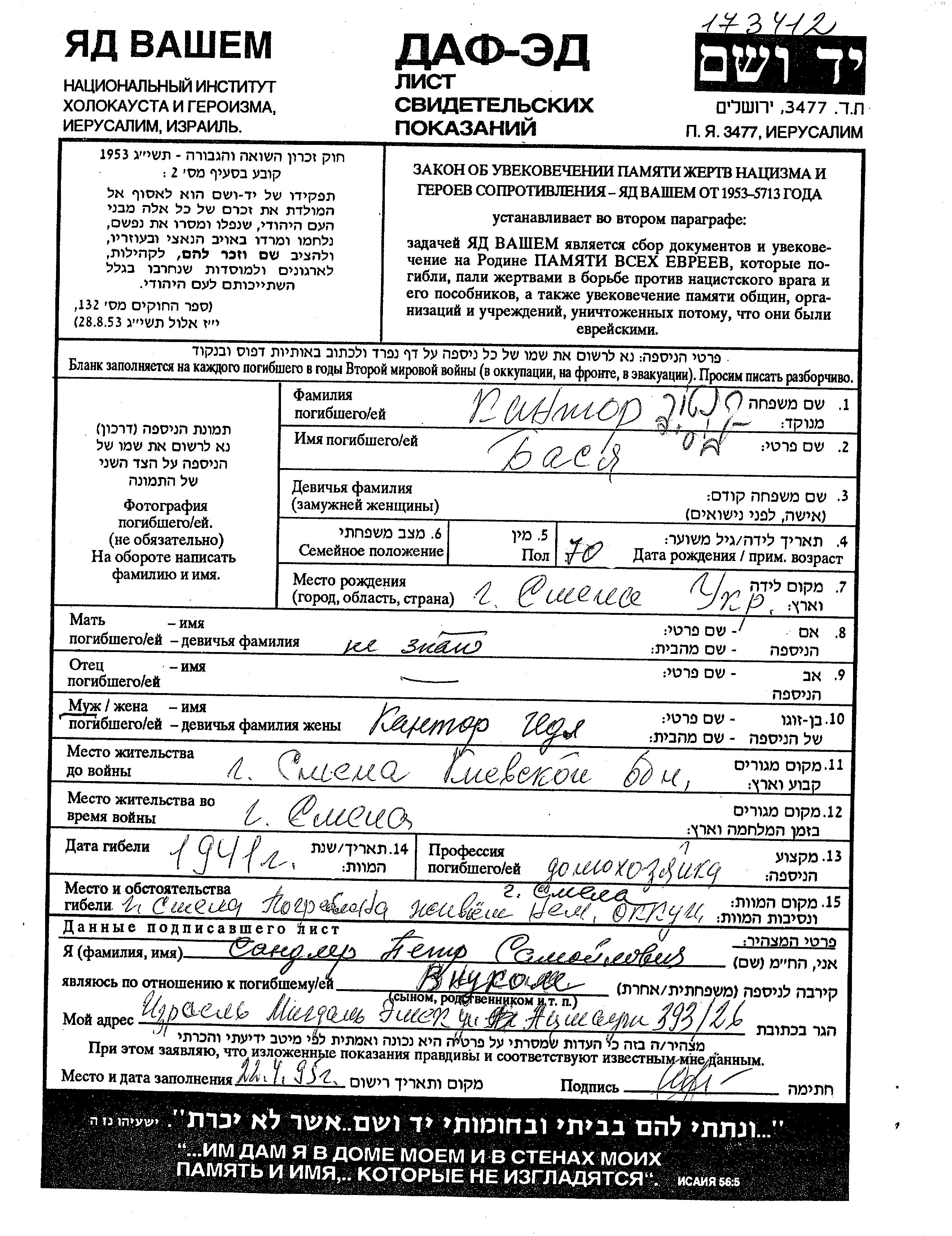 Basya Kantor wurde im Jahr 1871 in Smela, Ukraine (UdSSR) geboren. Sie war Hausfrau und mit Idl Verheiratet. Vor dem Zweiten Weltkrieg lebte sie in Smela, Ukraine (UdSSR). Während des Krieges war sie in Smela, Ukraine (UdSSR).