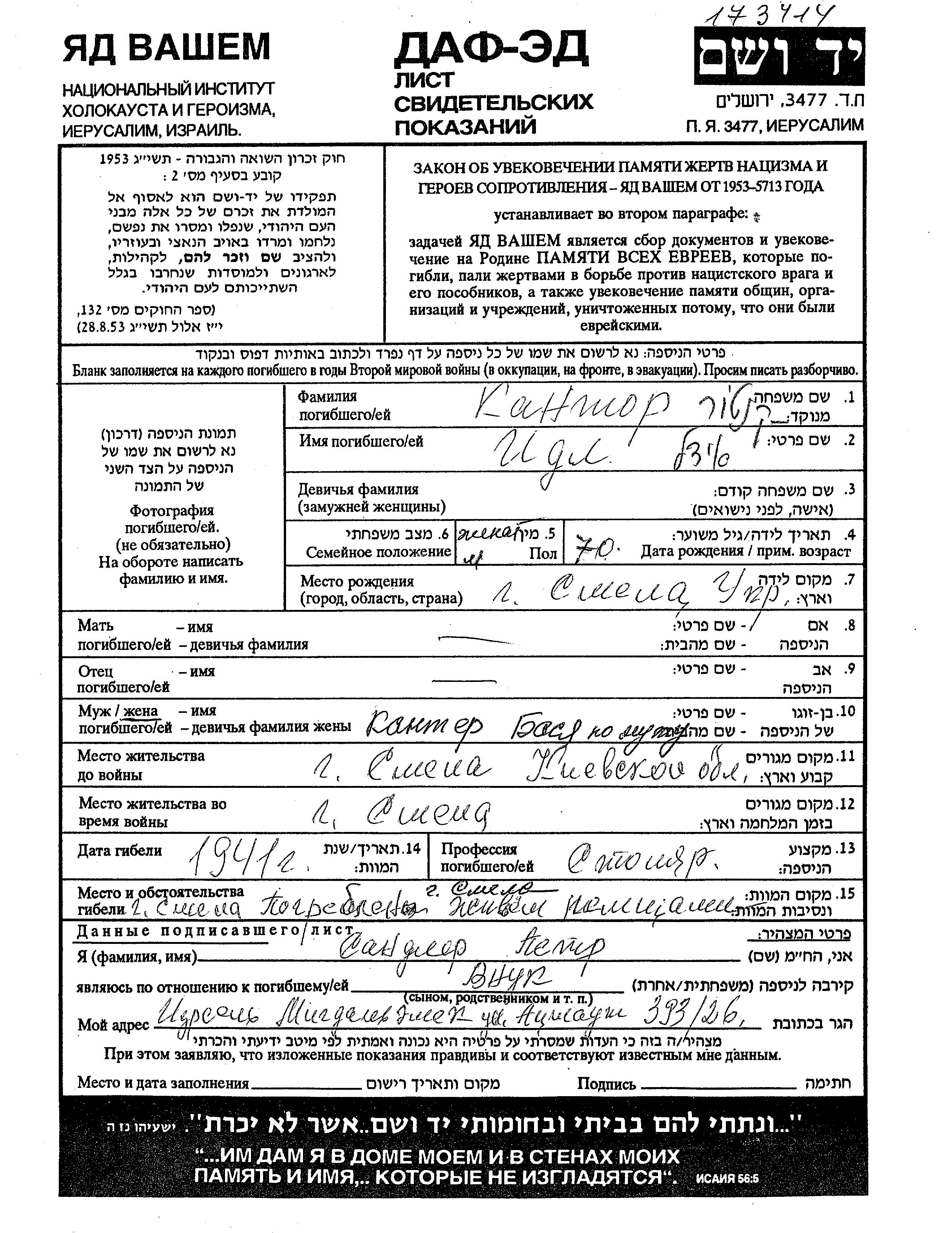Idl Kantor wurde im Jahr 1871 in Smela, Ukraine (UdSSR) geboren. Er war Zimmermann und mit Basya Verheiratet. Vor dem Zweiten Weltkrieg lebte er in Smela, Ukraine (UdSSR). Während des Krieges war er in Smela, Ukraine (UdSSR).