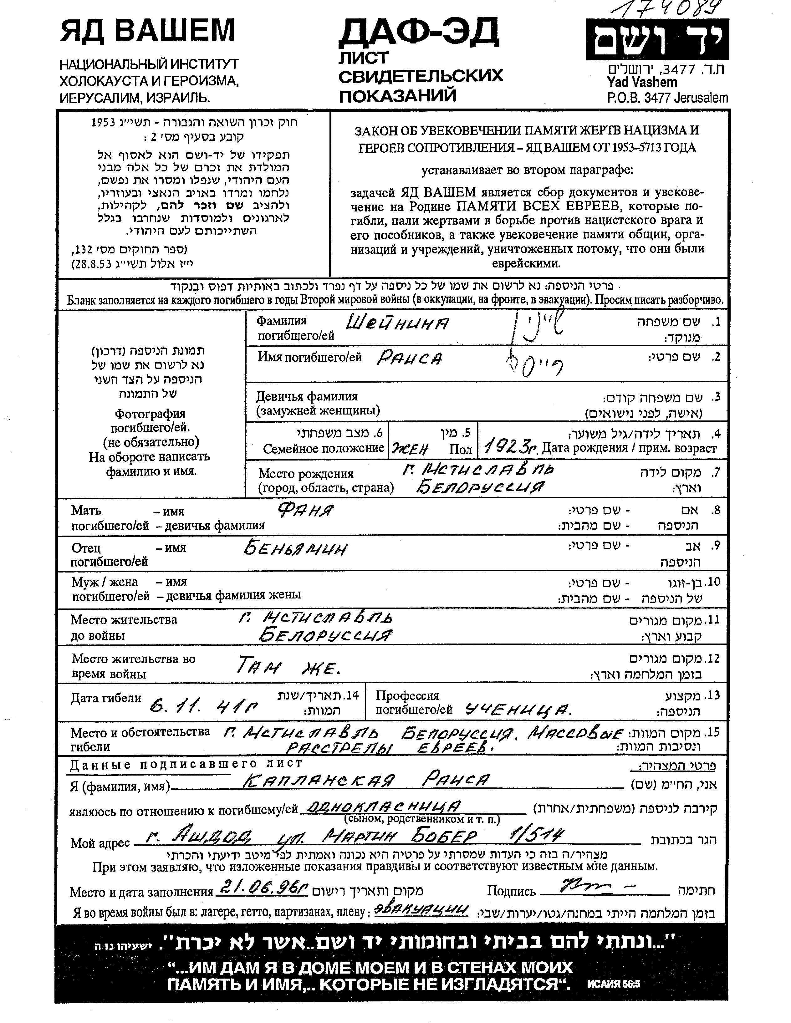 Sheynina Raisa 1923 Mstislavl, Weißrussland (UdSSR) Verfolgtenliste