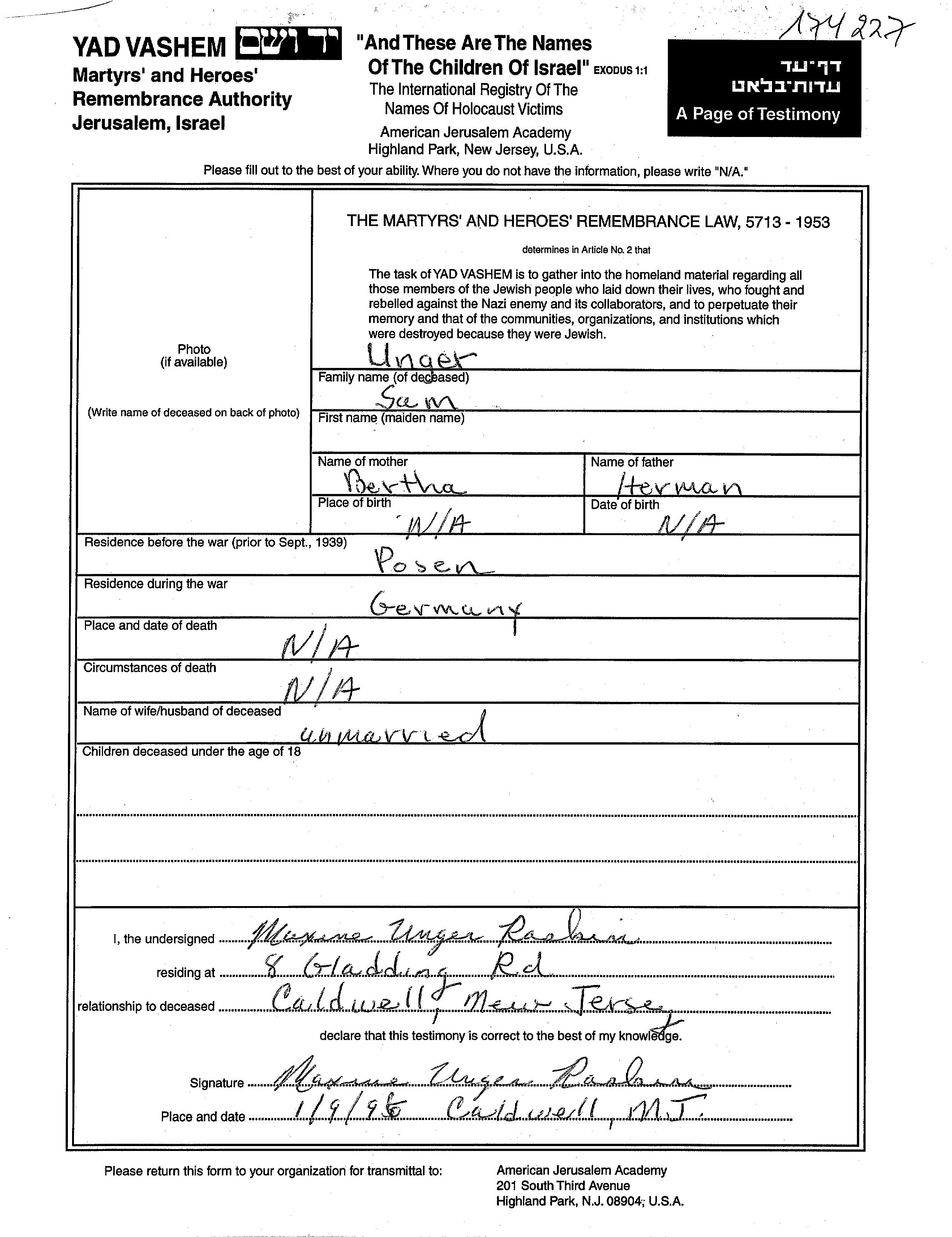 Sam Unger wurde Er war der Sohn von Herman und Bertha. Vor dem Zweiten Weltkrieg lebte er in Poznan, Polen. Während des Krieges war er in Deutsches Reich.
