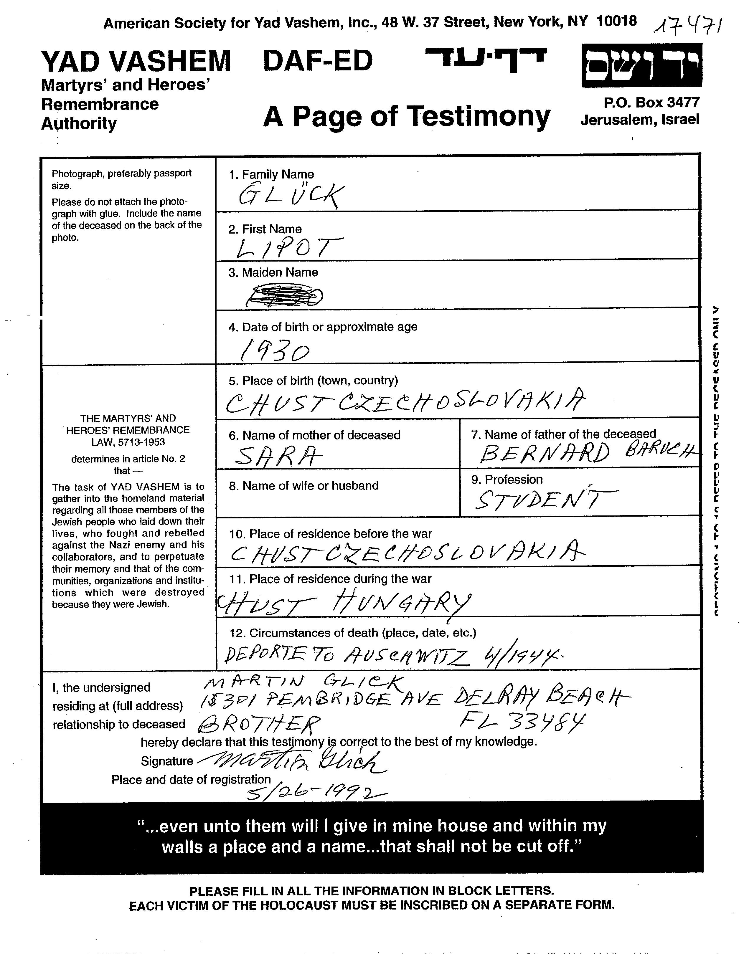 Lipot Glück wurde im Jahr 1930 in Chust, Tschechoslowakei geboren. Er war der Sohn von Bernard Baruch und Sara, geb. Berkovits. Er war Schüler/-in und Kind. Vor dem Zweiten Weltkrieg lebte er in Chust, Tschechoslowakei. Während des Krieges war er in Chust, Tschechoslowakei.