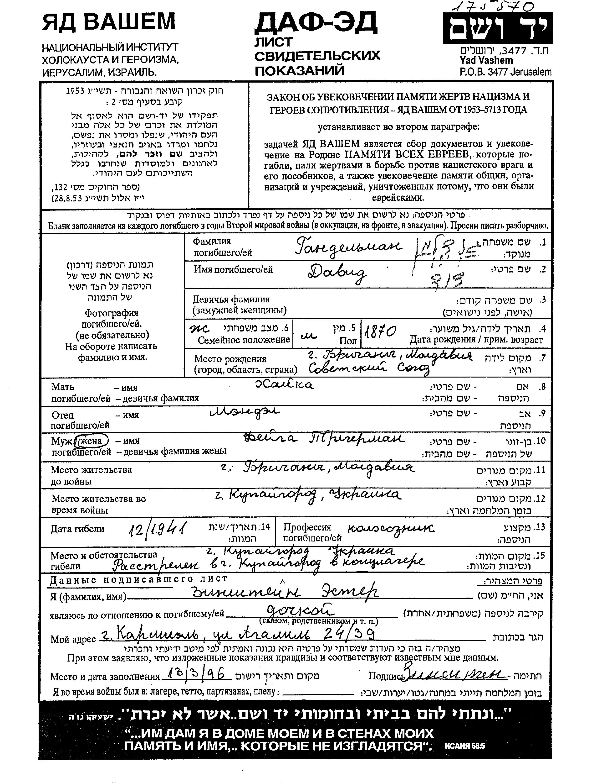 David Gandelman wurde im Jahr 1870 in Briceni, Rumänien geboren. Er war der Sohn von Mendel und Khaika. Er war Landwirt und mit Feiga Verheiratet. Vor dem Zweiten Weltkrieg lebte er in Briceni, Rumänien. Während des Krieges war er in Kopaygorod, Ukraine (UdSSR).