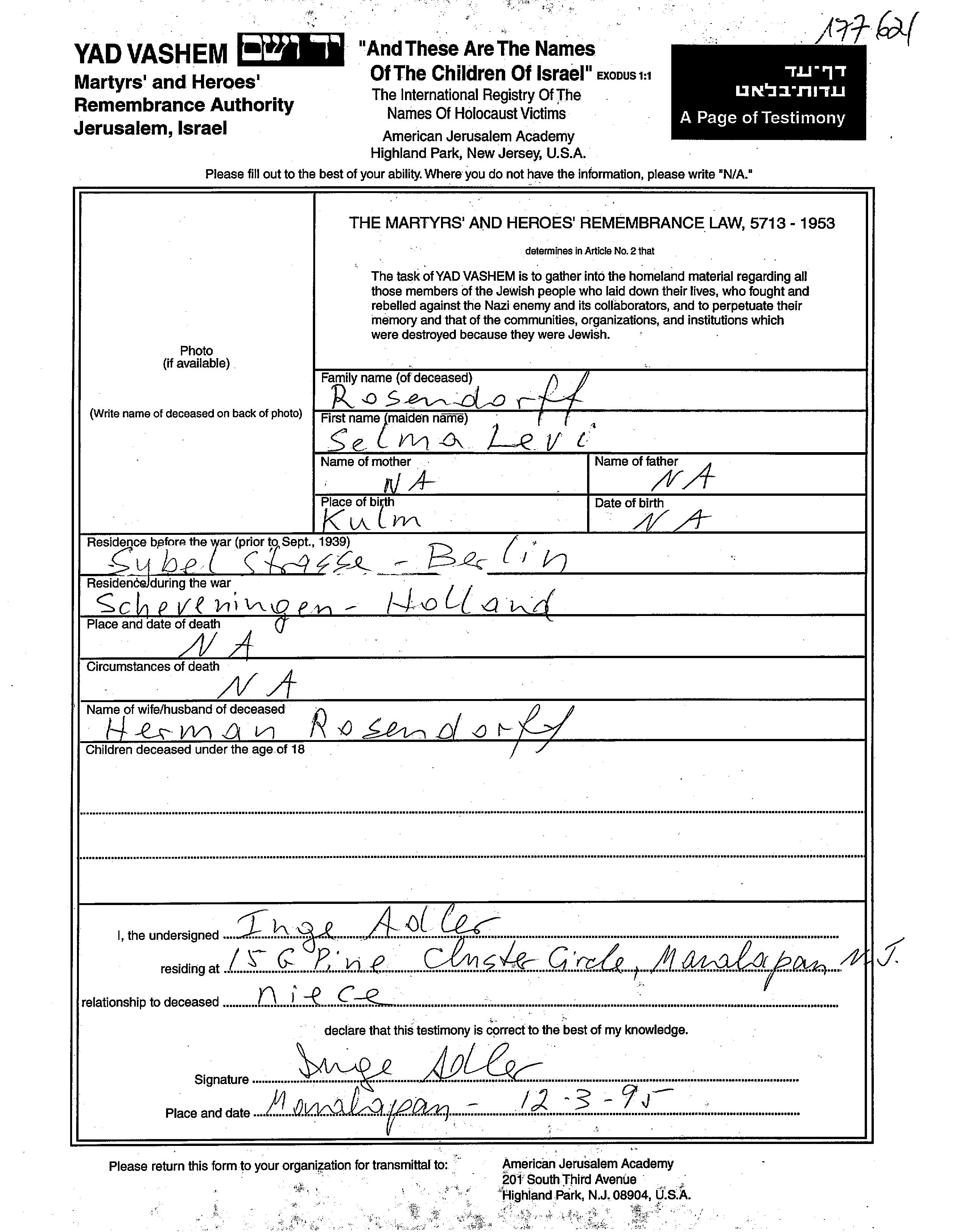 Selma Rosendorff, geb. Levi wurde in Kulm, Polen geboren. Sie war mit Herman Verheiratet. Vor dem Zweiten Weltkrieg lebte sie in Berlin, Deutsches Reich. Während des Krieges war sie in Scheveningen, Niederlande.