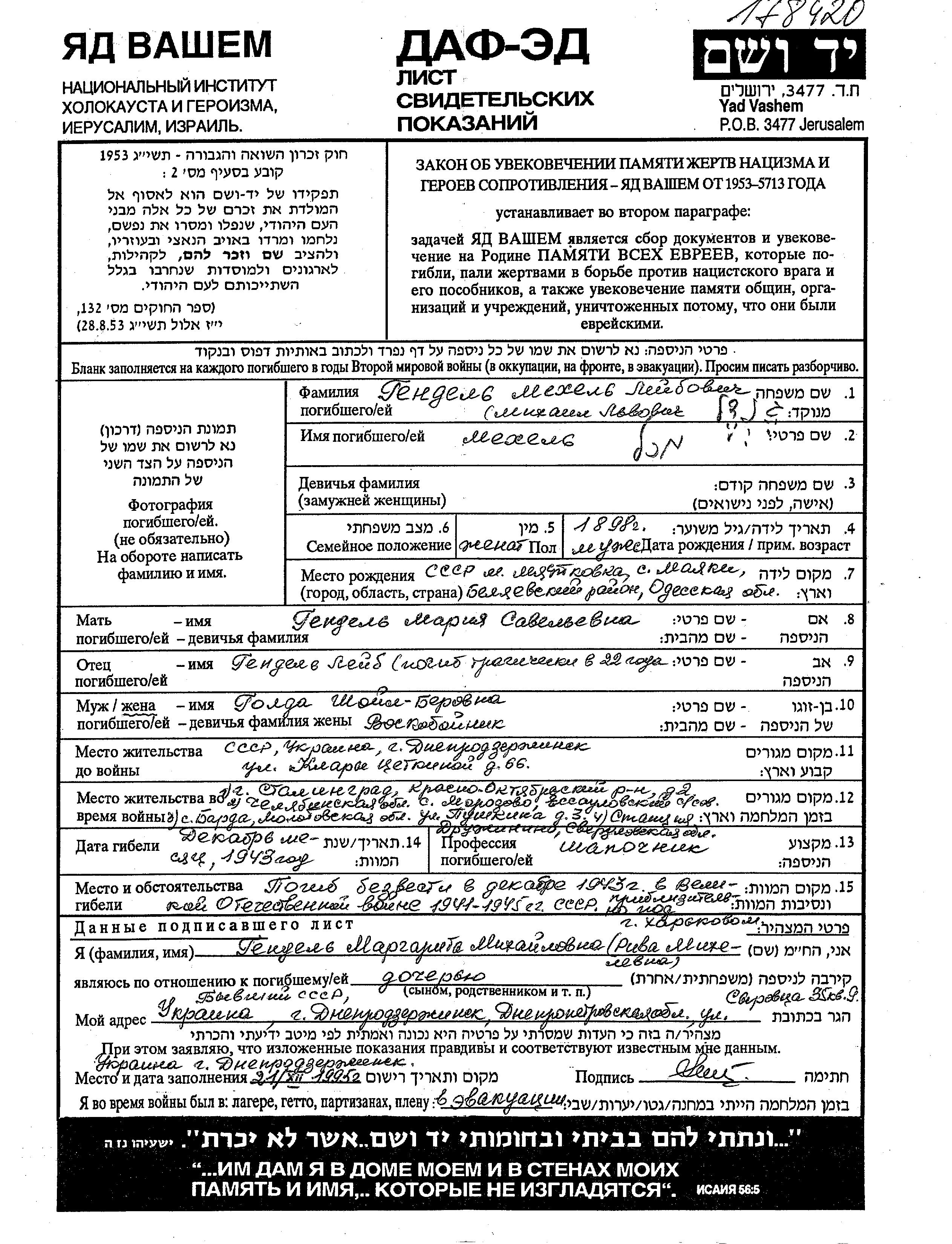 Mekhel Gendel wurde im Jahr 1898 in Odessa, Ukraine (UdSSR) geboren. Er war der Sohn von Leib und Mariya. Er war Hutmacher/-in und mit Golda Verheiratet. Vor dem Zweiten Weltkrieg lebte er in Dneprodzerzhinsk, Ukraine (UdSSR). Während des Krieges war er in die Sowjetischen Streitkräfte.