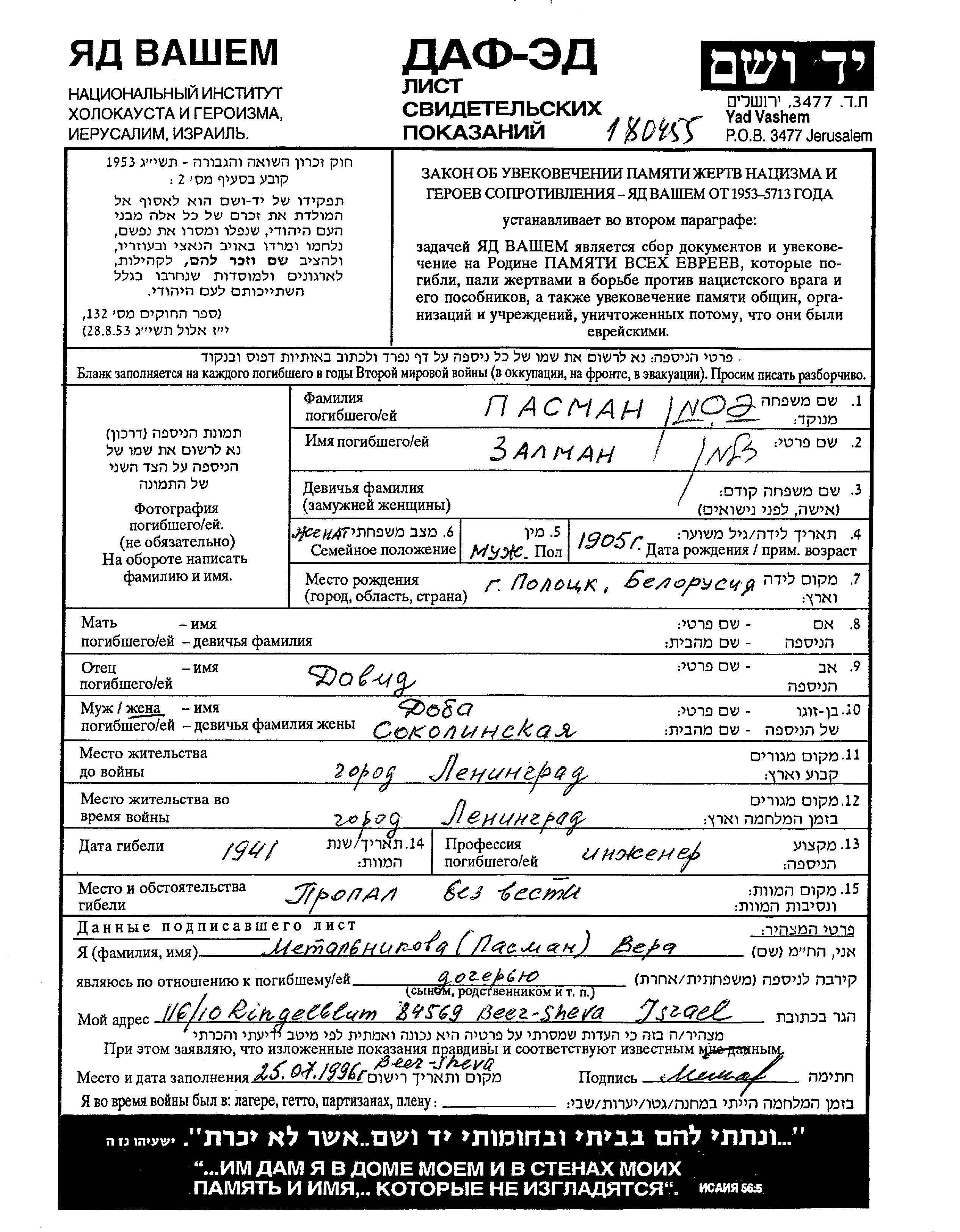 Zalman Pasman Fasman wurde im Jahr 1905 in Polotsk, Weißrussland (UdSSR) geboren. Er war der Sohn von David. Er war Ingenieur und mit Doba Verheiratet. Vor dem Zweiten Weltkrieg lebte er in Leningrad, Russland (UdSSR). Während des Krieges war er in Leningrad, Russland (UdSSR).