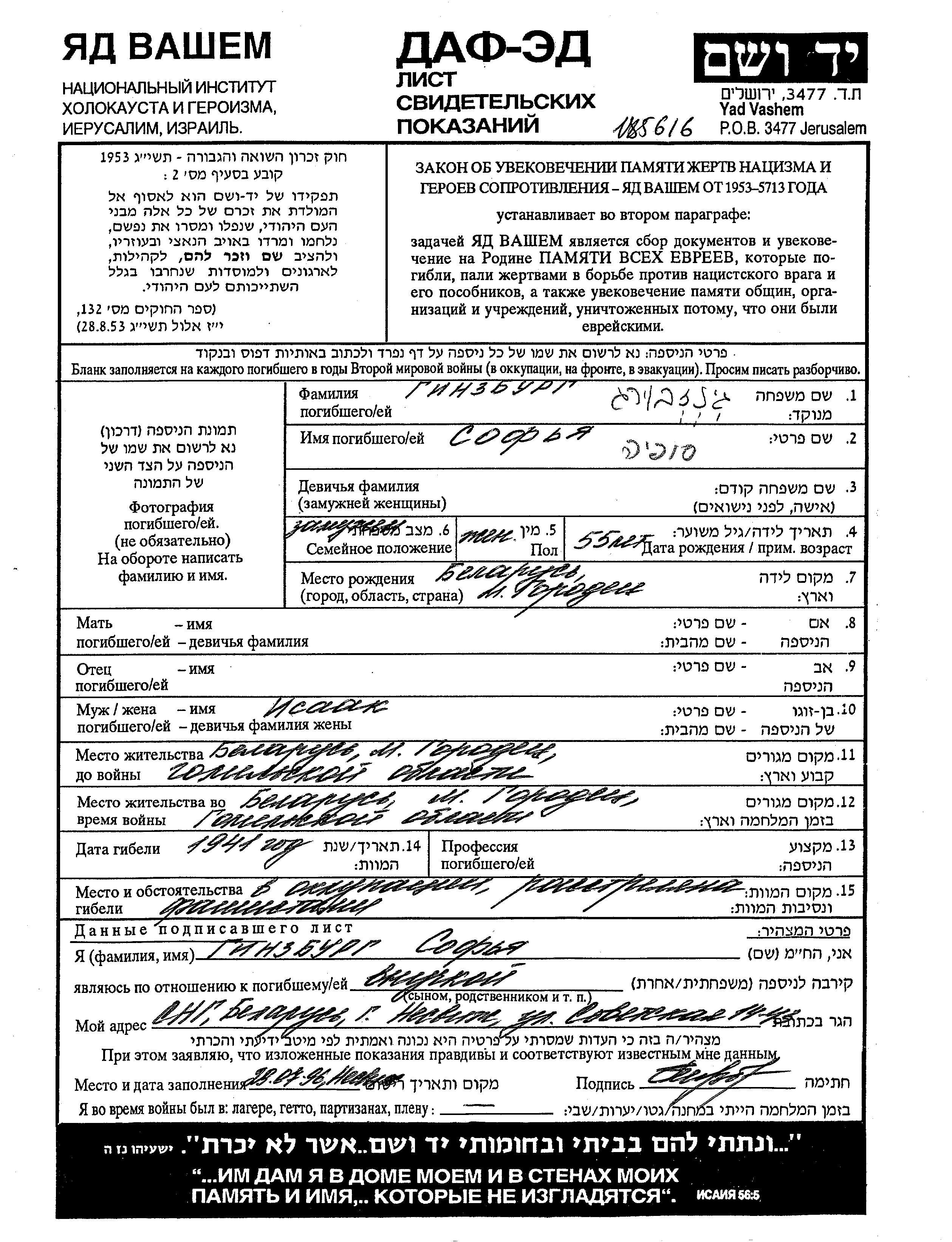 Sofya Ginzburg wurde im Jahr 1886 in Gorodets, Weißrussland (UdSSR) geboren. Sie war mit Isaak Verheiratet. Vor dem Zweiten Weltkrieg lebte sie in Gorodets, Weißrussland (UdSSR). Während des Krieges war sie in Gorodets, Weißrussland (UdSSR).
