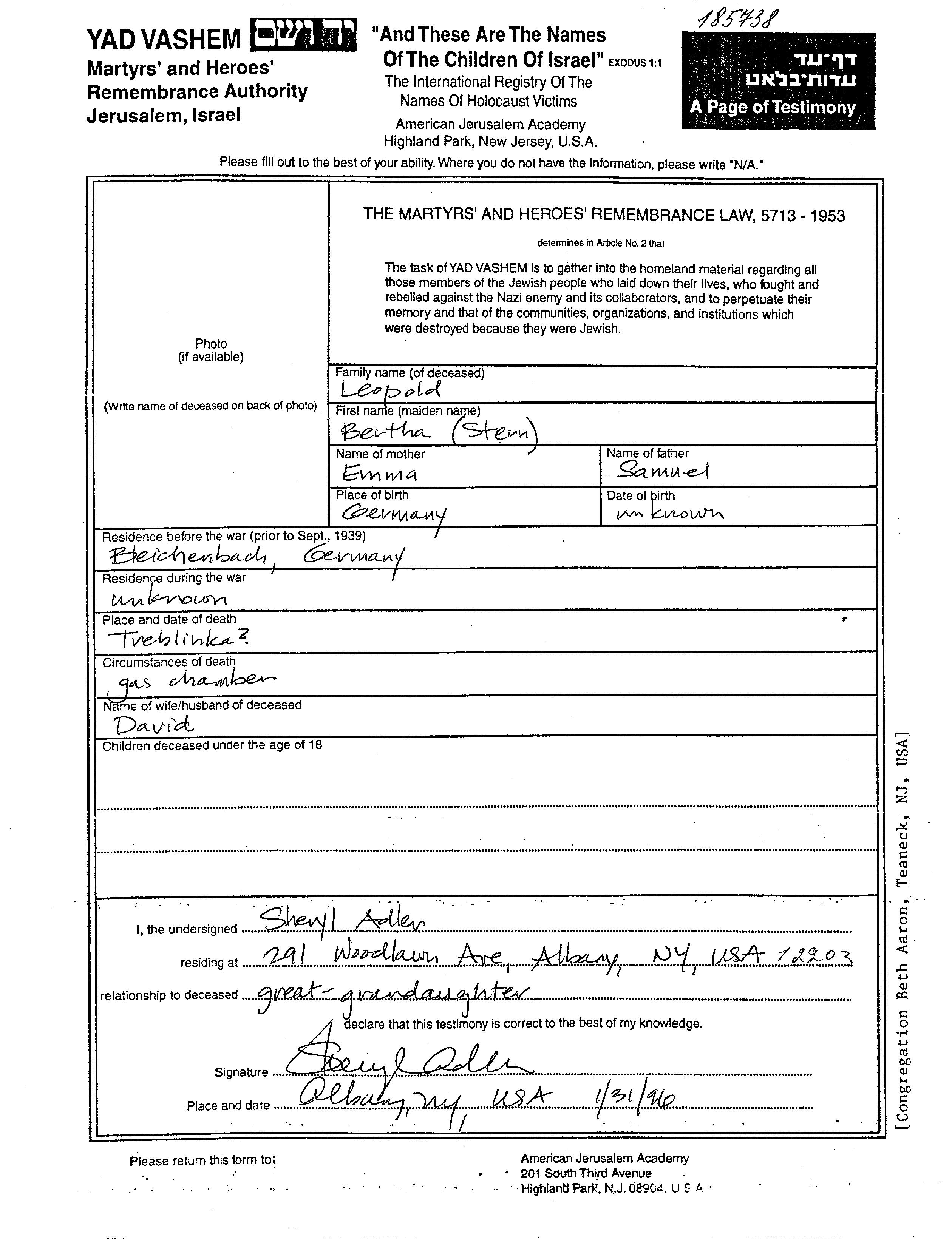 Bertha wurde in der Schoah ermordet. Todesort: Treblinka, Polen.
