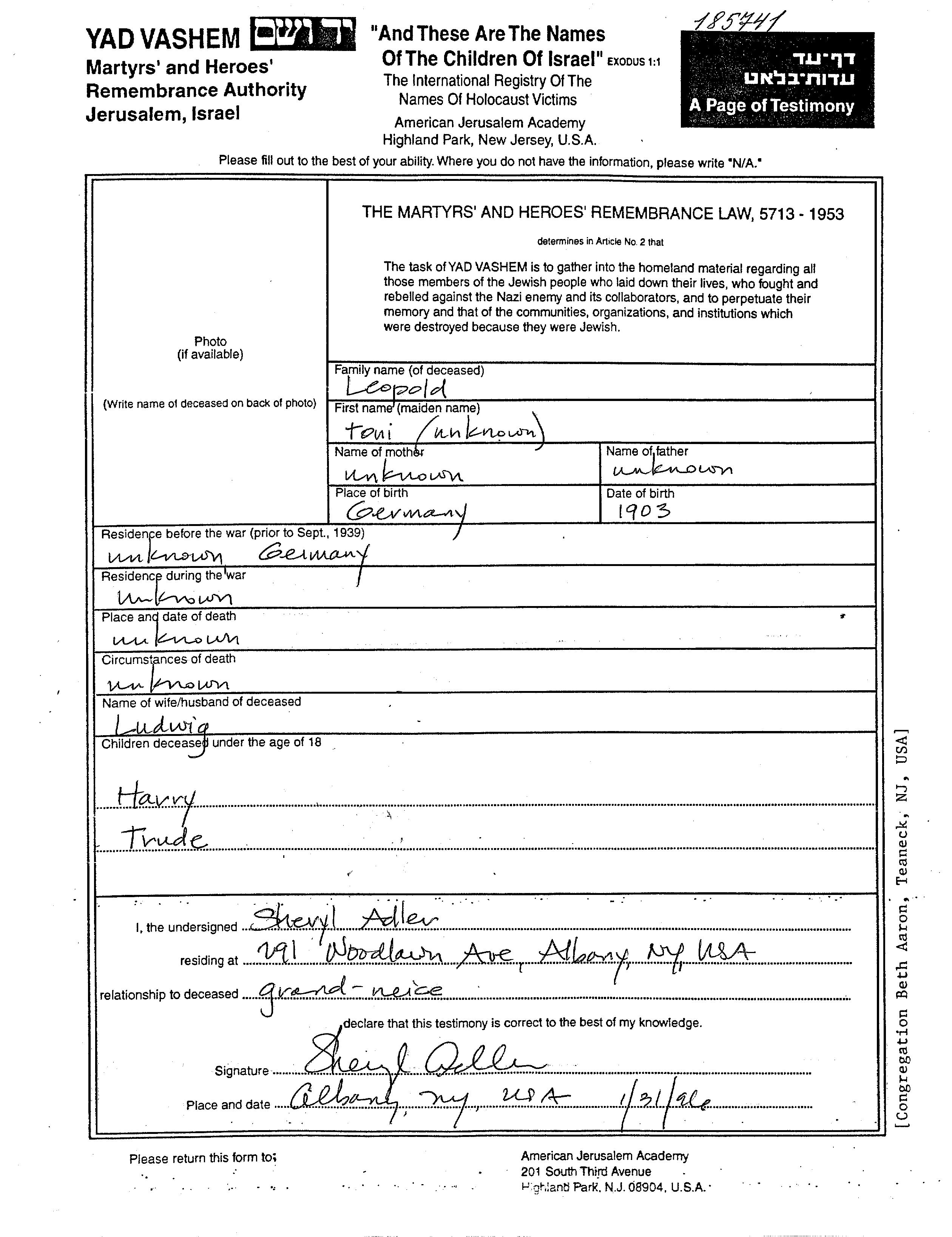 Toni Leopold wurde im Jahr 1903 in Deutsches Reich geboren. Sie war mit Ludwig Verheiratet. Vor dem Zweiten Weltkrieg lebte sie in Deutsches Reich.