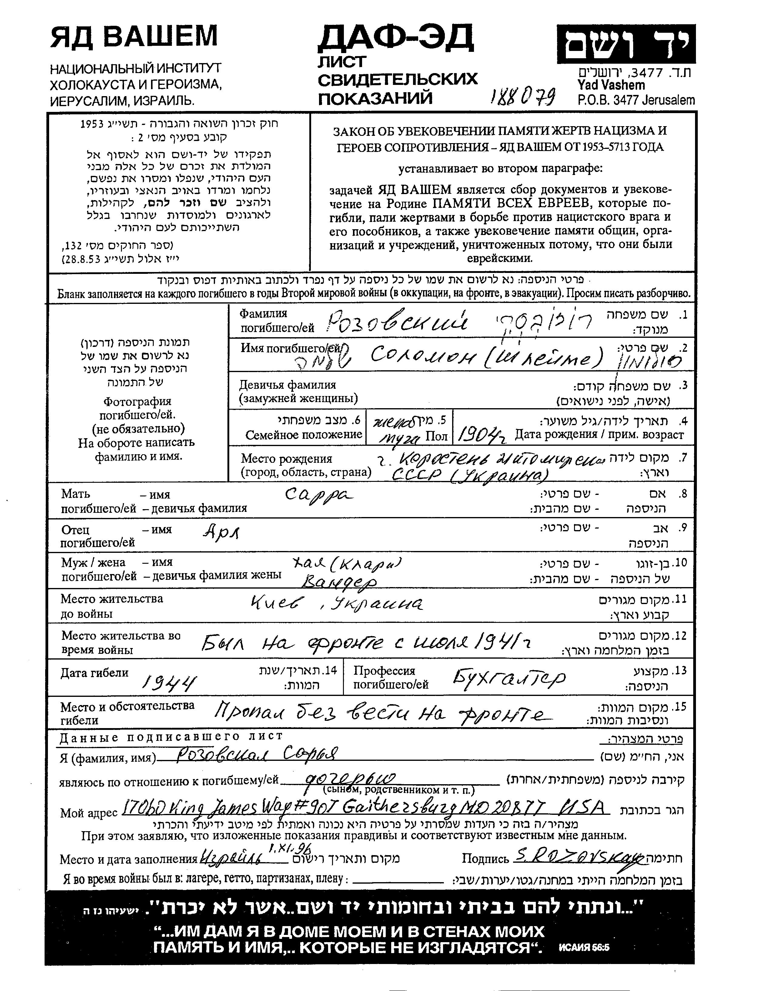 Solomon Rozovski wurde im Jahr 1904 in Korosten, Ukraine (UdSSR) geboren. Er war der Sohn von Arl und Sara. Er war Buchhalter/-in und mit Khaia Klara Verheiratet. Vor dem Zweiten Weltkrieg lebte er in Kiyev, Ukraine (UdSSR). Während des Krieges war er in die Sowjetischen Streitkräfte.