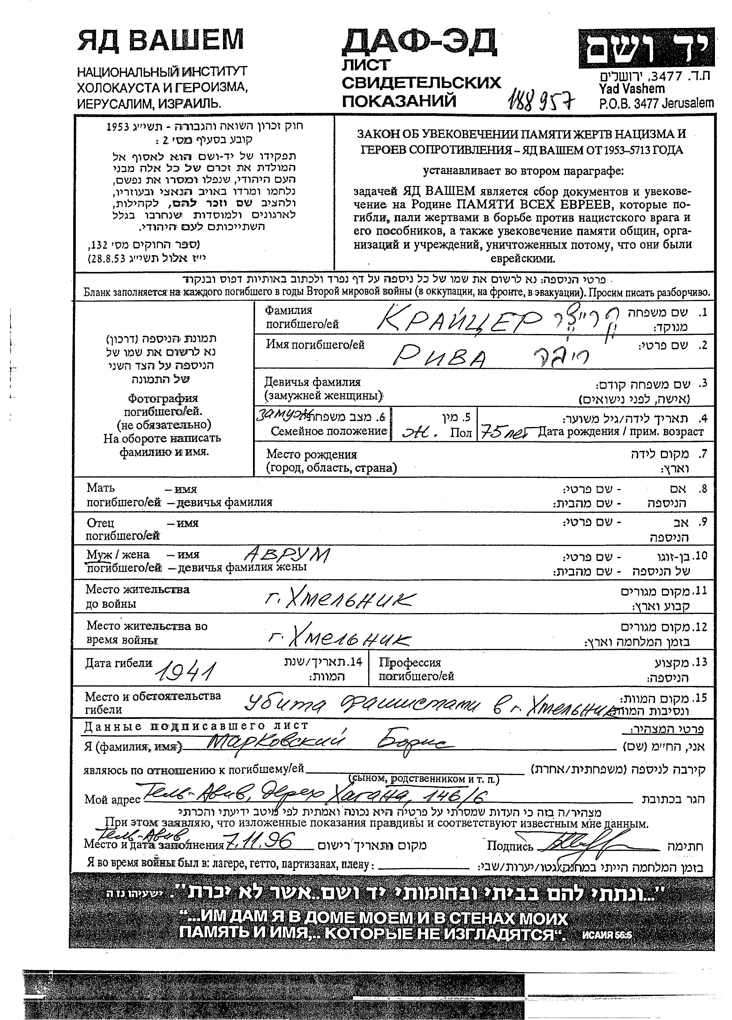 Riva Kraitzer wurde im Jahr 1866 geboren. Sie war mit Avrum Verheiratet. Vor dem Zweiten Weltkrieg lebte sie in Khmelnik, Ukraine (UdSSR). Während des Krieges war sie in Khmelnik, Ukraine (UdSSR).
