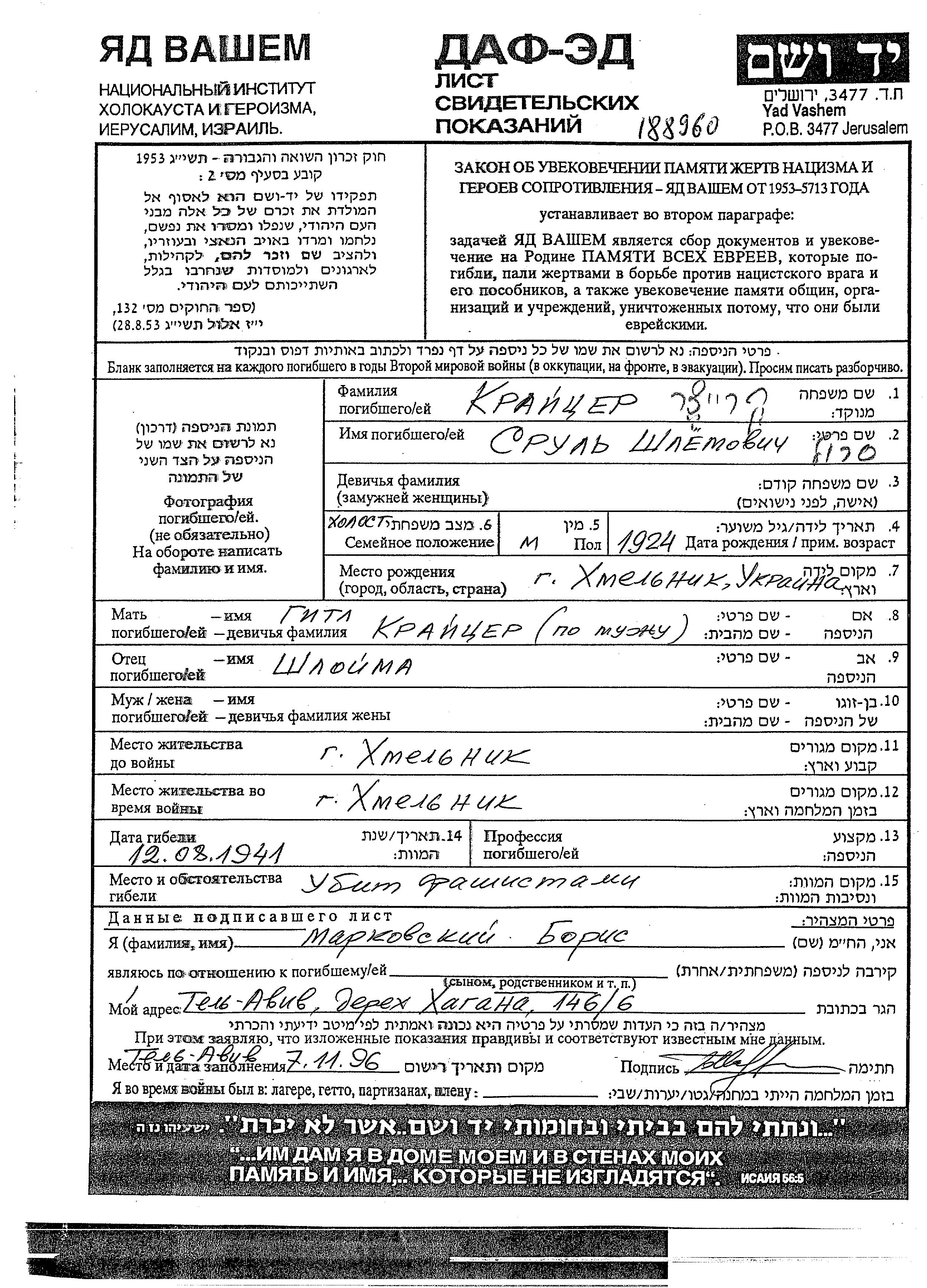 Srul Kraitzer wurde im Jahr 1924 in Khmelnik, Ukraine (UdSSR) geboren. Er war der Sohn von Shloima und Gitl. Er war Kind. Vor dem Zweiten Weltkrieg lebte er in Khmelnik, Ukraine (UdSSR). Während des Krieges war er in Khmelnik, Ukraine (UdSSR).