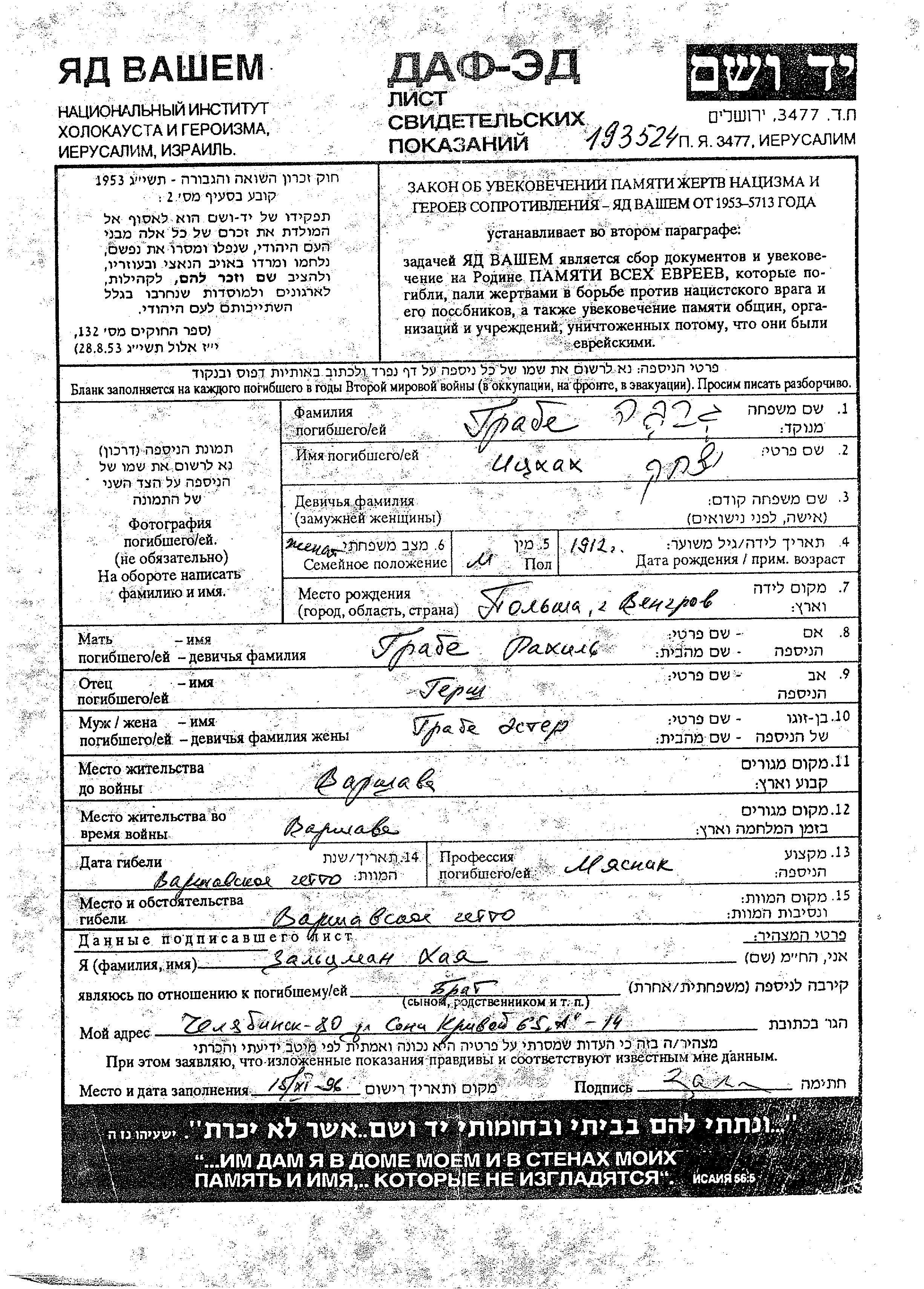 Yitzkhak wurde in der Schoah ermordet. Todesort: Warszawa, Polen.