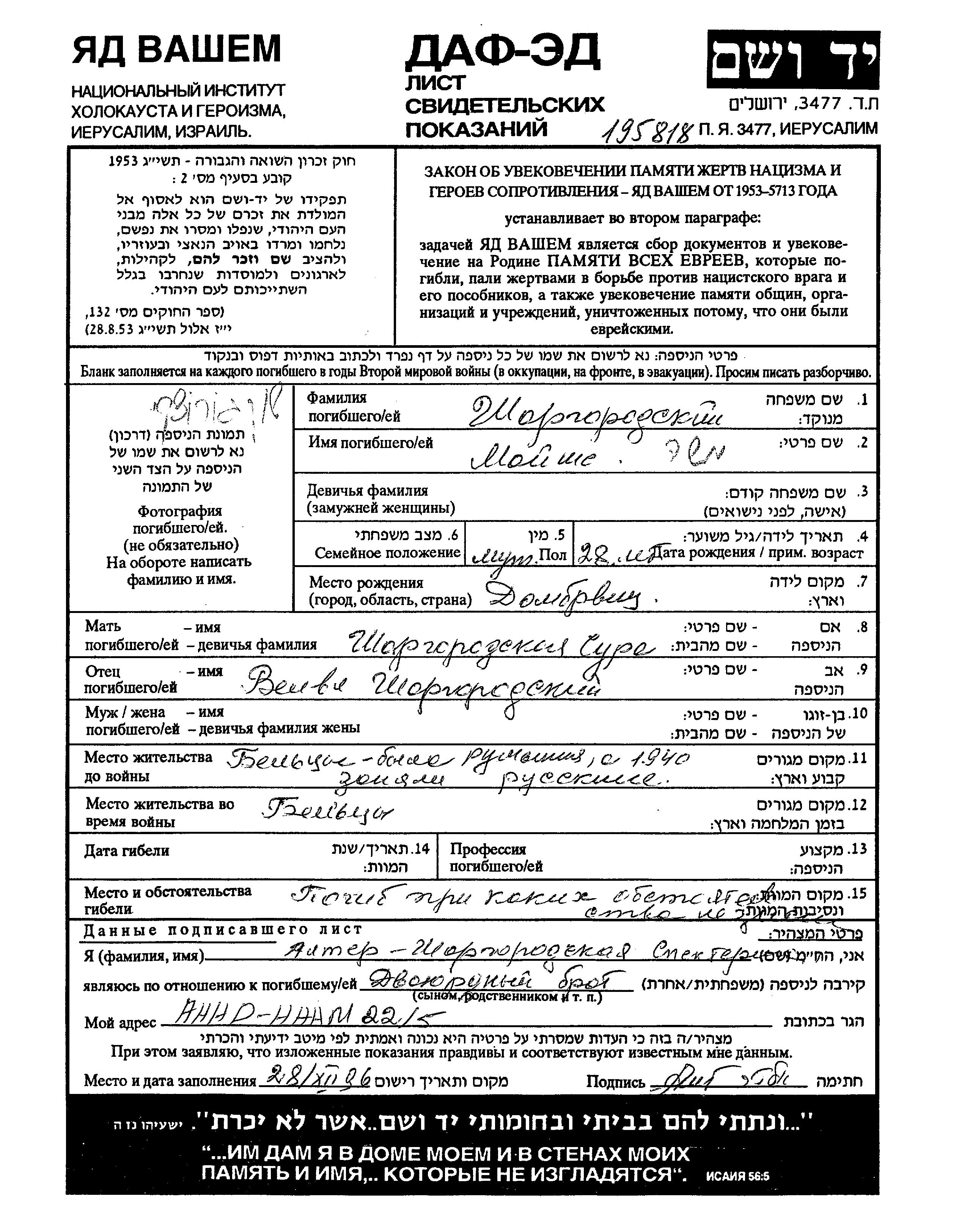 Moishe Shargorodski wurde in Dumbrăviţa, Rumänien geboren. Er war der Sohn von Velvl und Sura. Vor dem Zweiten Weltkrieg lebte er in Beltz, Rumänien. Während des Krieges war er in Beltz, Rumänien.