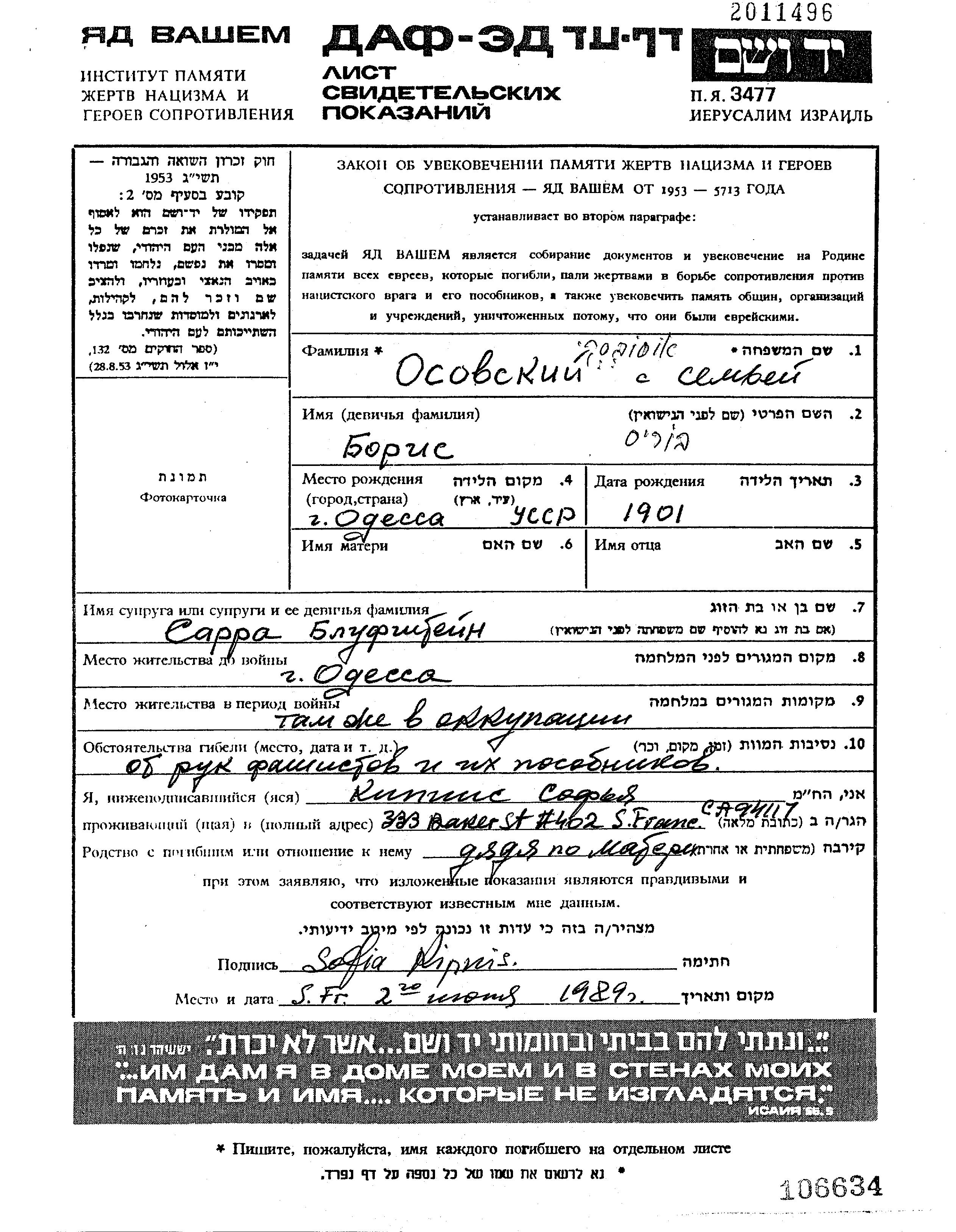 Boris Osovski wurde im Jahr 1901 in Odessa, Ukraine (UdSSR) geboren. Er war mit Sara Verheiratet. Vor dem Zweiten Weltkrieg lebte er in Odessa, Ukraine (UdSSR). Während des Krieges war er in Odessa, Ukraine (UdSSR).