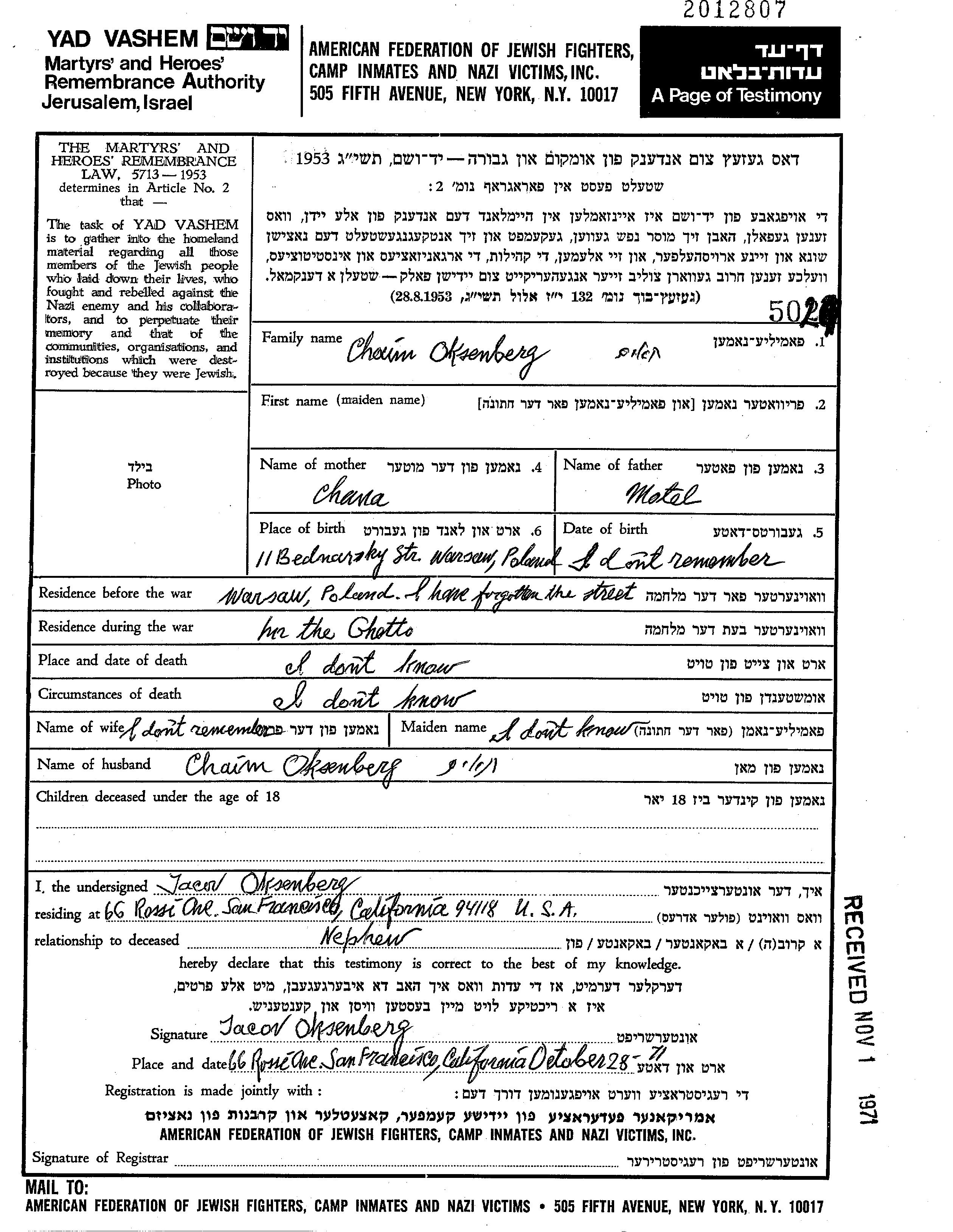 Oksenberg Chaim Warszawa, Polen Gedenkblatt