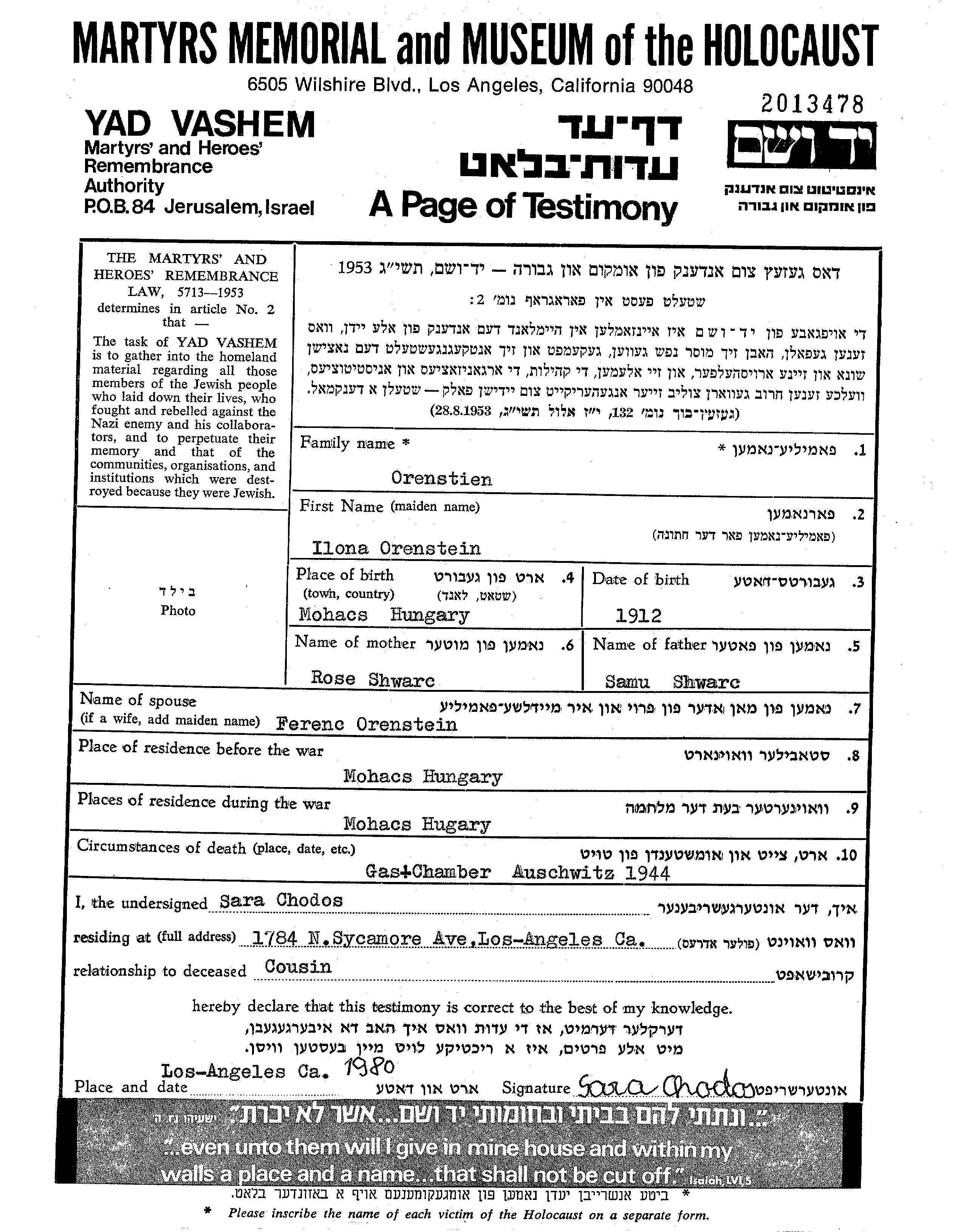 Ilona Orenstein, geb. Shwarc wurde im Jahr 1912 in Mohacs, Ungarn geboren. Sie war die Tochter von Samu und Roza. Sie war mit Ferentz Verheiratet. Vor dem Zweiten Weltkrieg lebte sie in Mohacs, Ungarn. Während des Krieges war sie in Mohacs, Ungarn.
