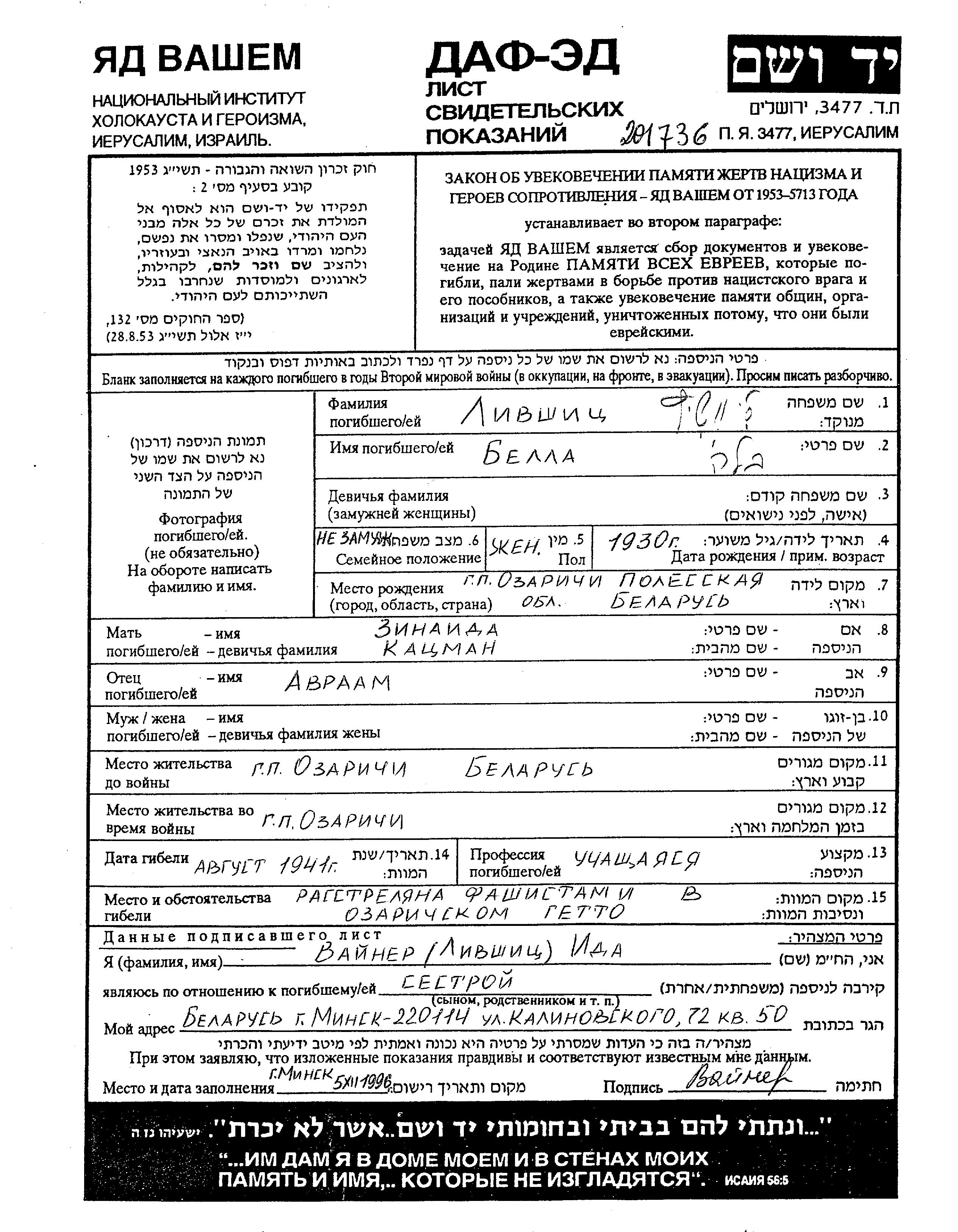 Bela Livshitz wurde im Jahr 1930 in Ozarichi, Weißrussland (UdSSR) geboren. Sie war die Tochter von Avraam und Zinaida, geb. Katzman. Sie war Schüler/-in und Kind. Vor dem Zweiten Weltkrieg lebte sie in Ozarichi, Weißrussland (UdSSR). Während des Krieges war sie in Ozarichi, Weißrussland (UdSSR).